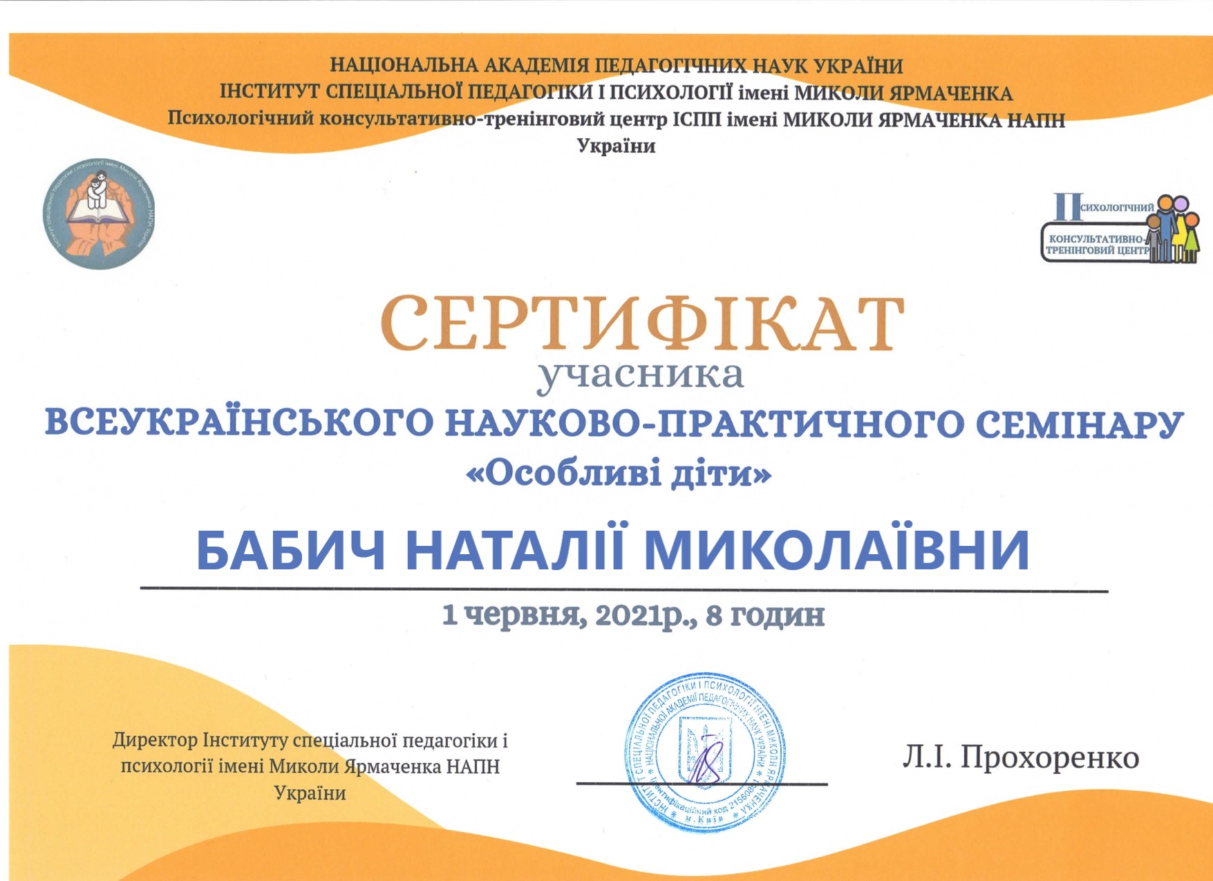 | 7262 | Всеукраїнський науково-практичний семінар "Особливі діти" | Участь у панельній дискусії | Інститут спеціальної педагогіки і психології імені Миколи Ярмаченка НАПН України |