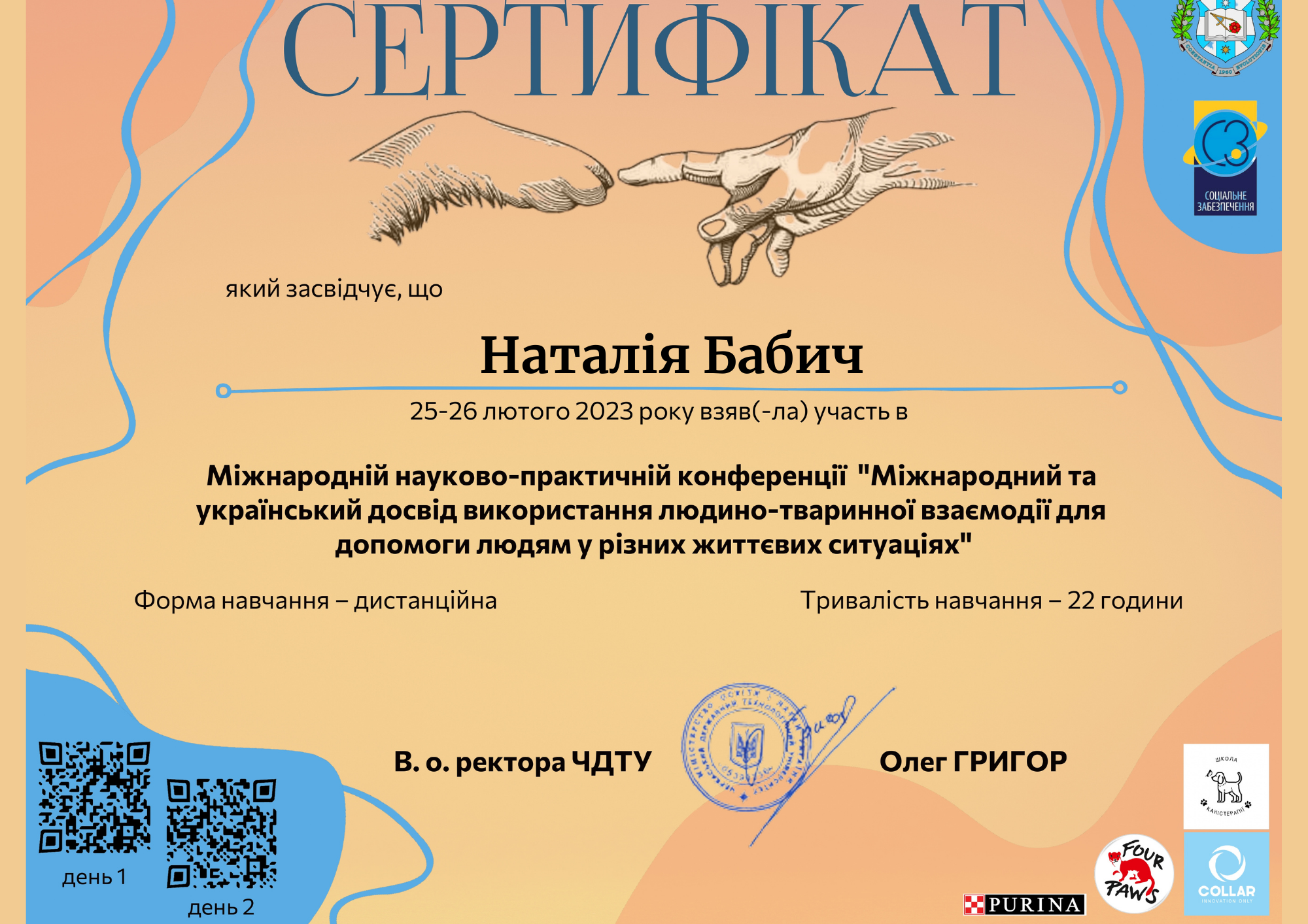 | 9350 | "Міжнародний та український досвід використання людино-тваринної взаємодії для допомогилюдям у різних життєвих ситуаціях" | Участь у панельній дискусії | ОНЛАЙН |