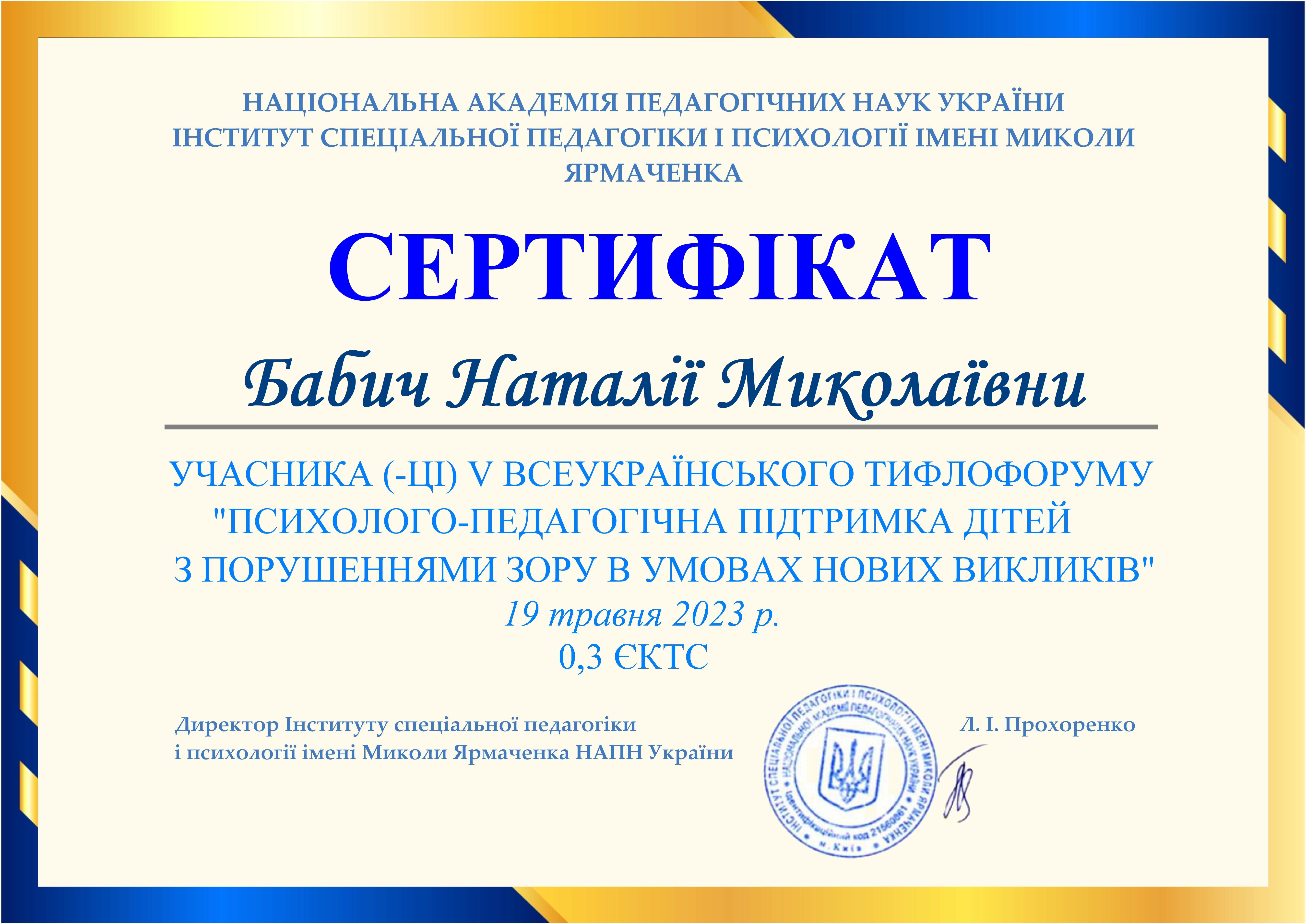 | 9351 | V Всеукраїнський тифлофорум "Психолого-педагогічна підтримка дітей з порушеннями зору в умовах нових викликів" | Пошук ресурсів для педагогів і родин, які виховують дітей з особливими потребами, в умовах воєнного стану | Інститут спеціальної педагогіки і психології імені Миколи Ярмаченка НАПН України |