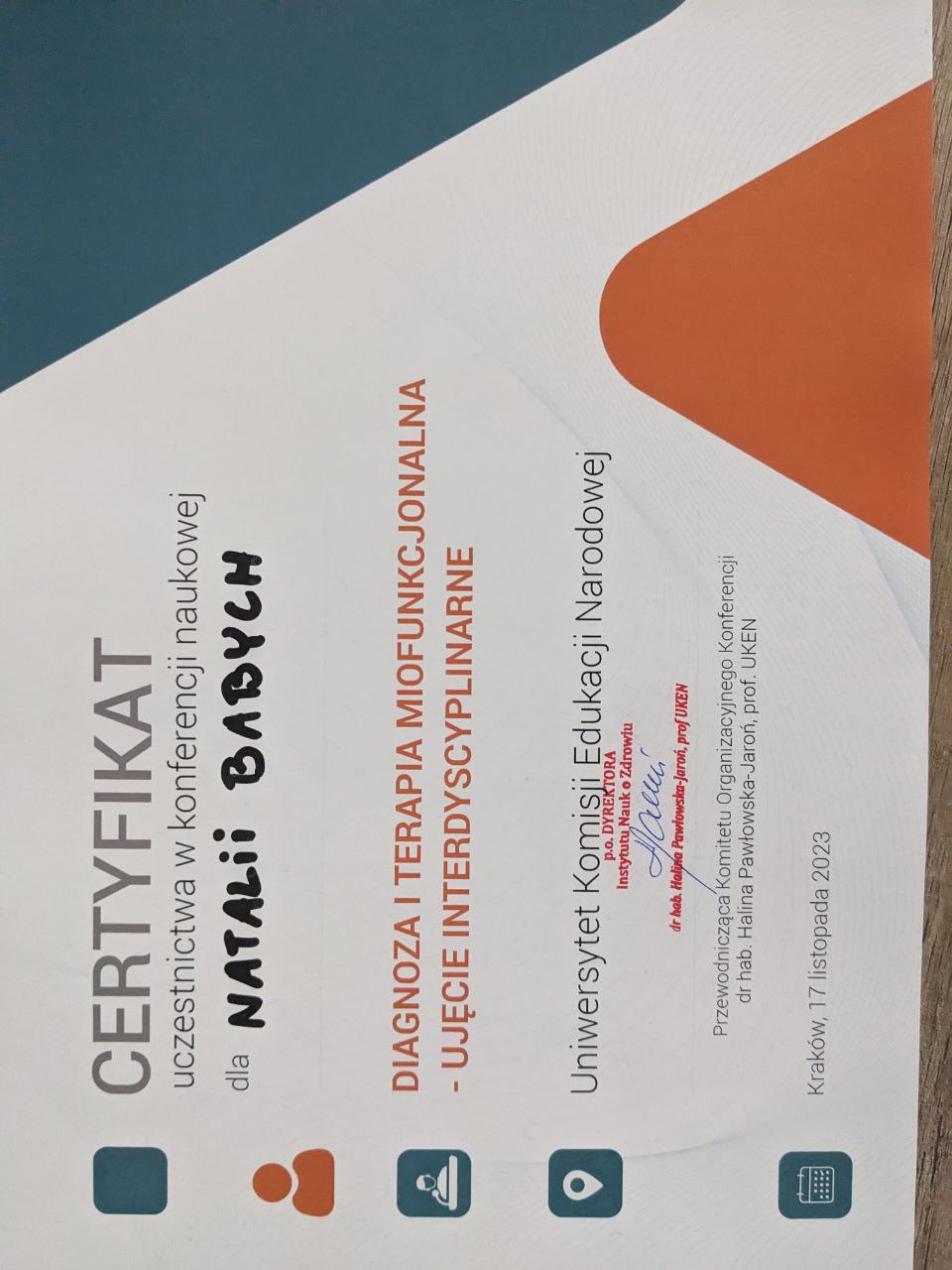 | 9742 | Konferencja Naukowa Diagnoza i terapia miofunkcjonalna – ujęcie interdyscyplinarne | Участь у тренінгах | Katedrę Logopedii i Zaburzeń Rozwoju w Uniwersytecie Komisji Edukacji Narodowej w Krakowie |