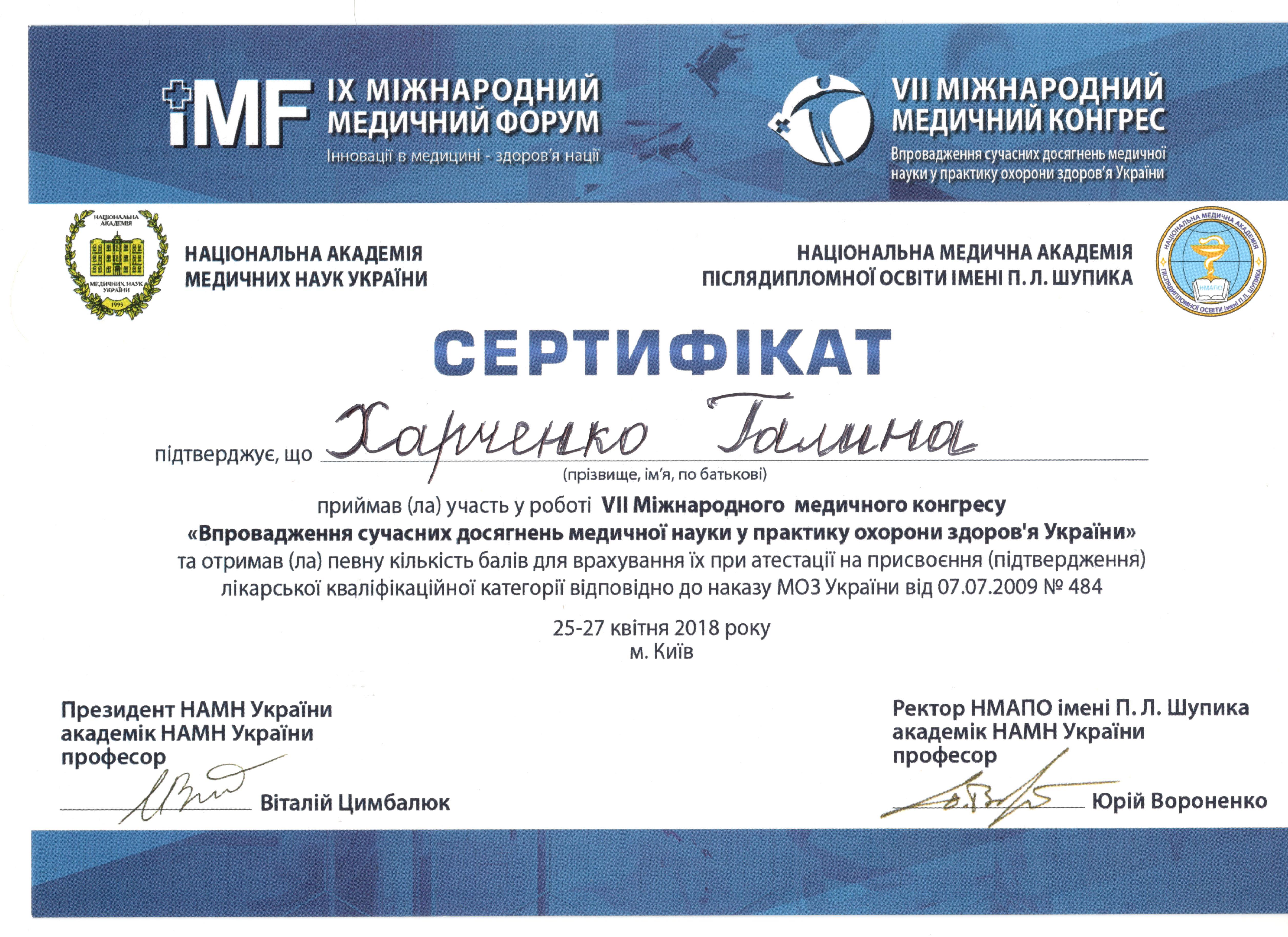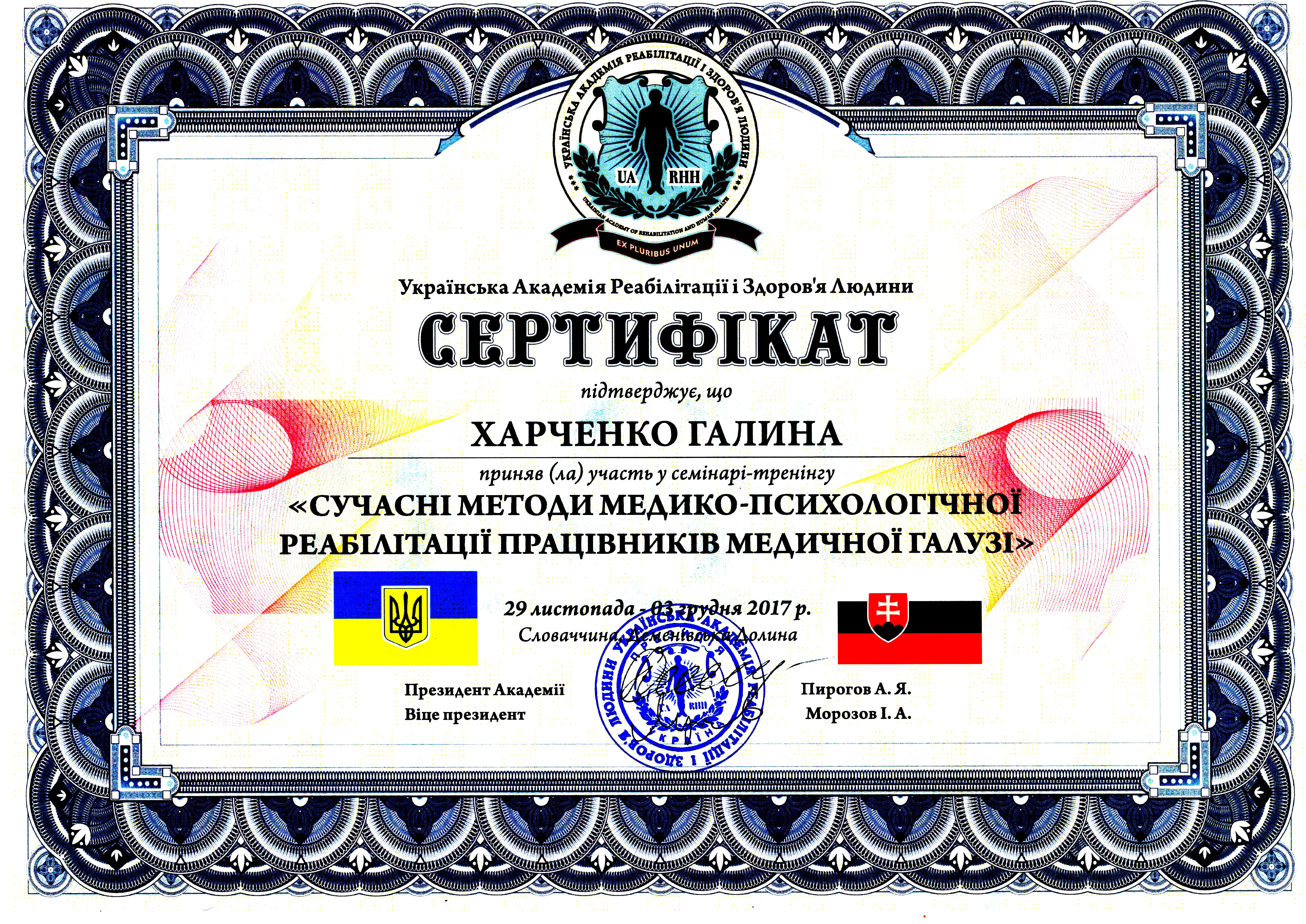 | 2309 | Сучасні методи медико-психологічної реабілітації працівників медичної галузі | учасник міжнародного семінару - тренінгу | Словаччина, Деменівська Долина |