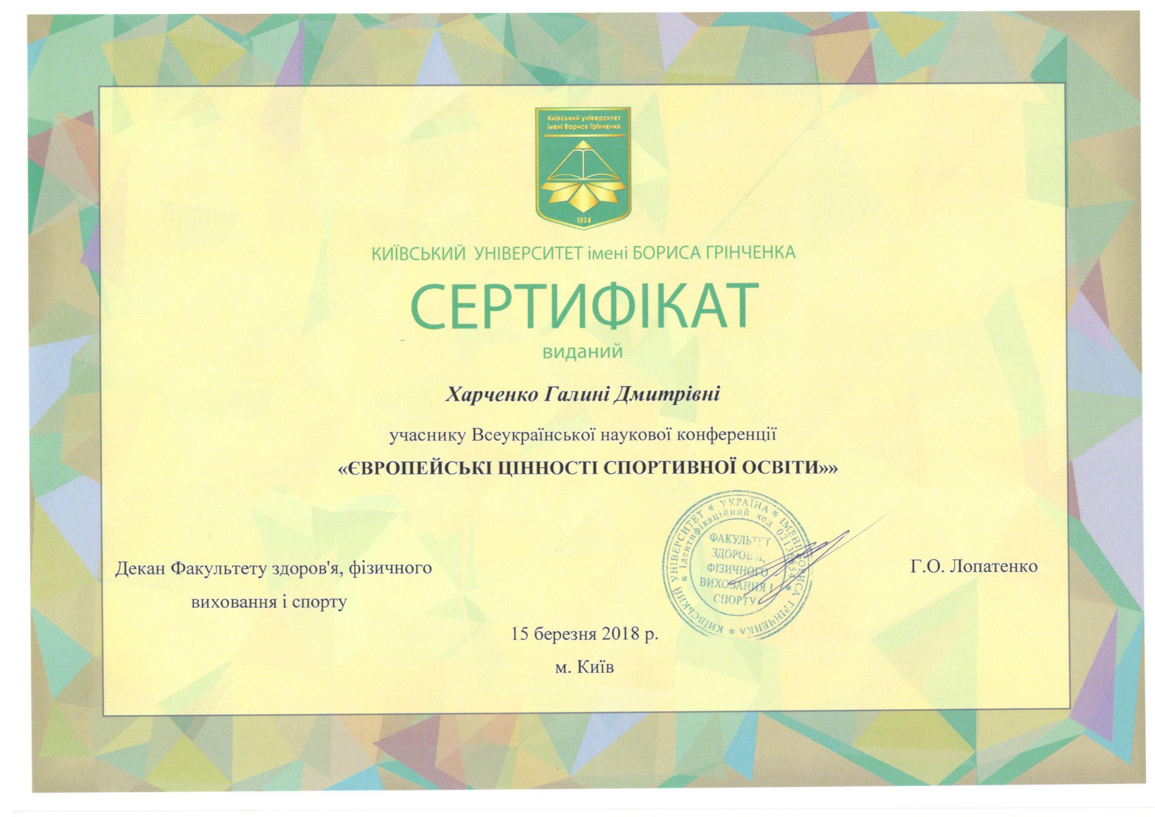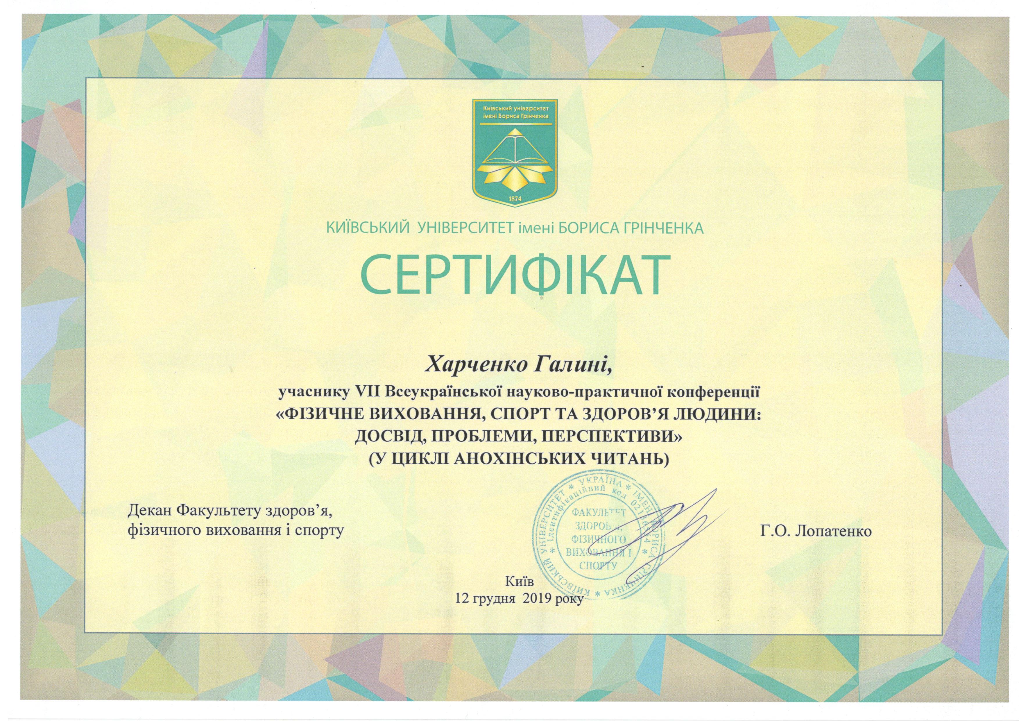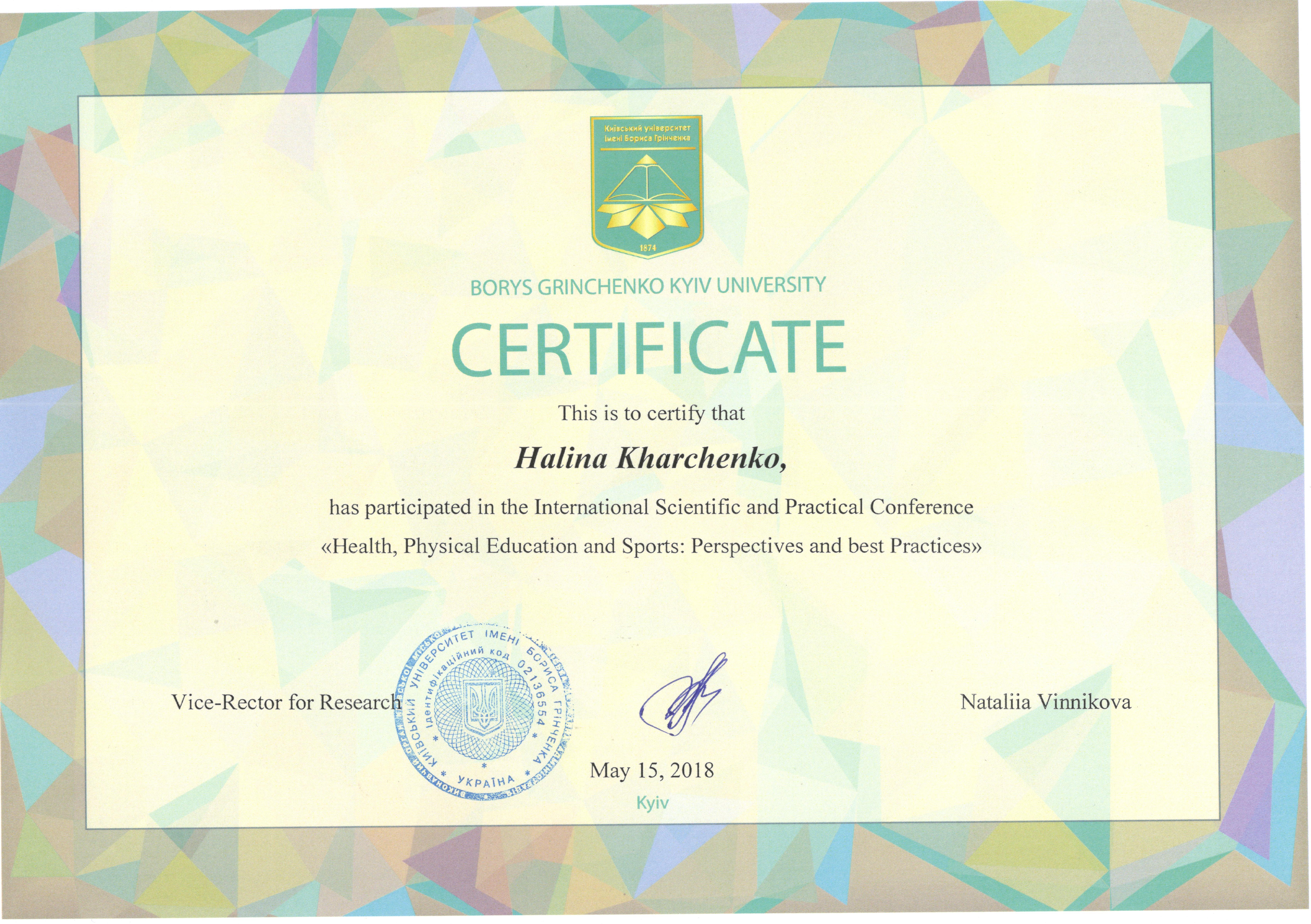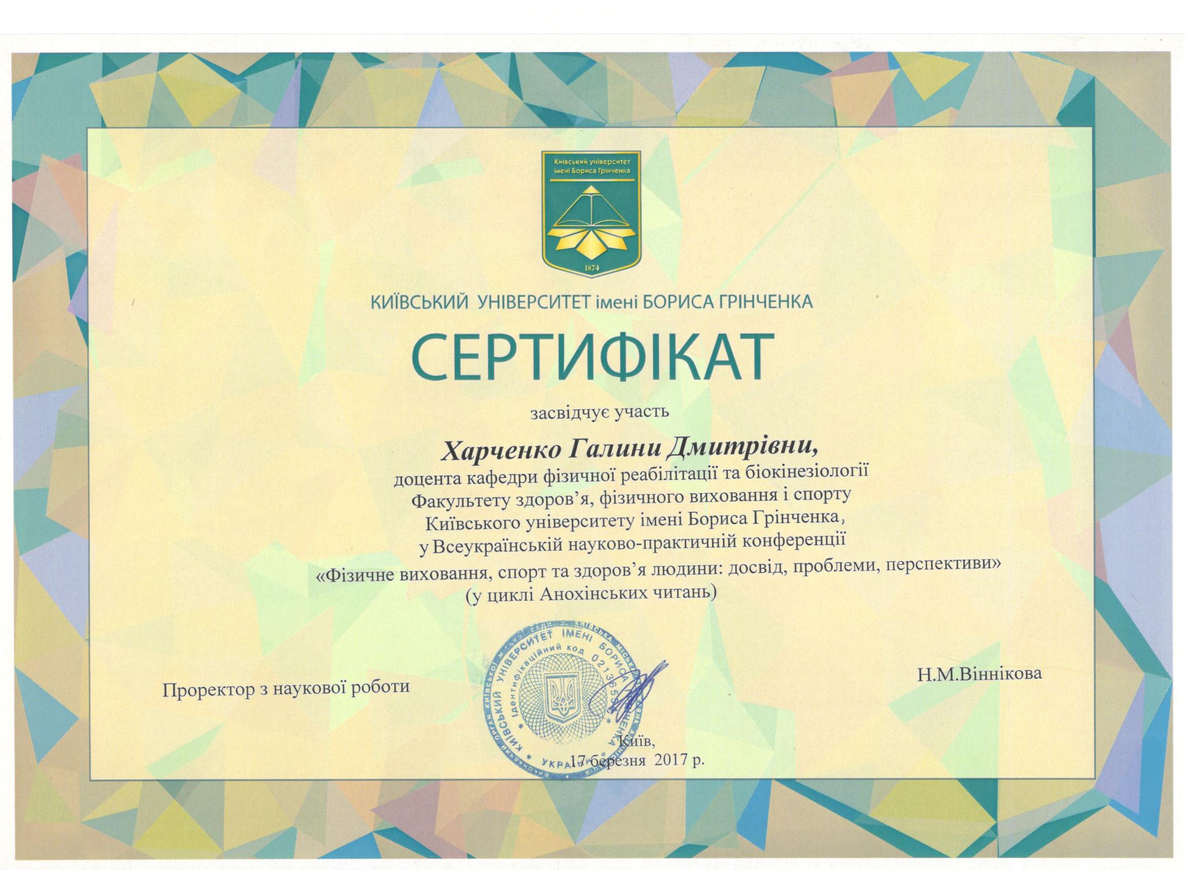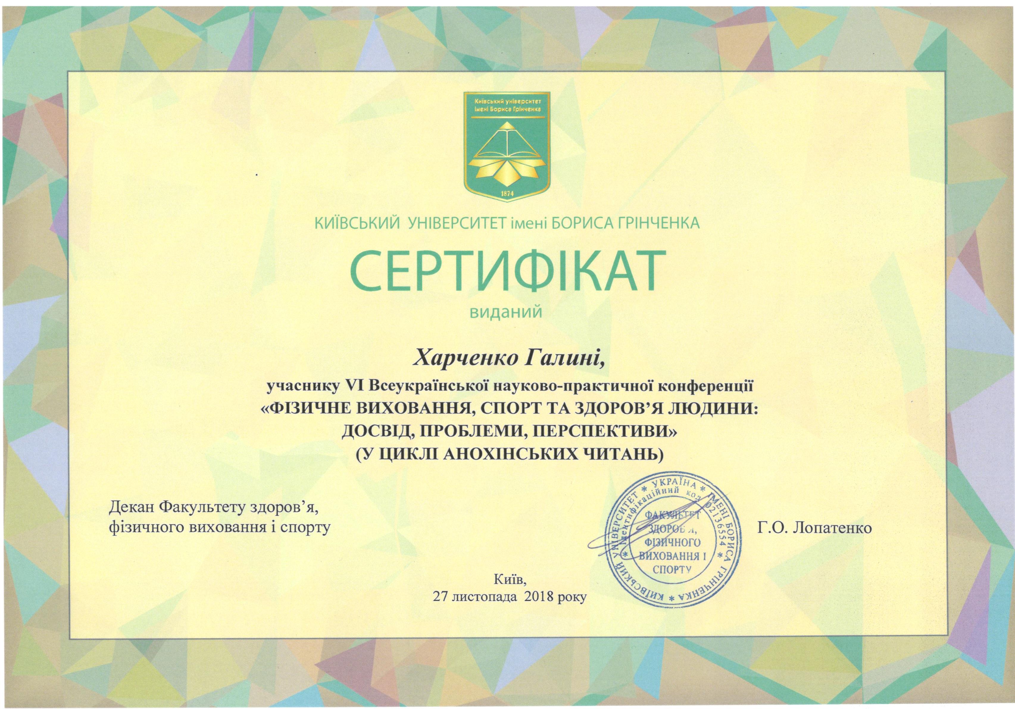 | 3460 | Фізичне виховання, спорт та здоров'я людини: досвід, проблеми, перспективи. ( у циклі Анохінських читань) | учасник VI Всеукраїнської науково-практичної конференції | м. Київ |