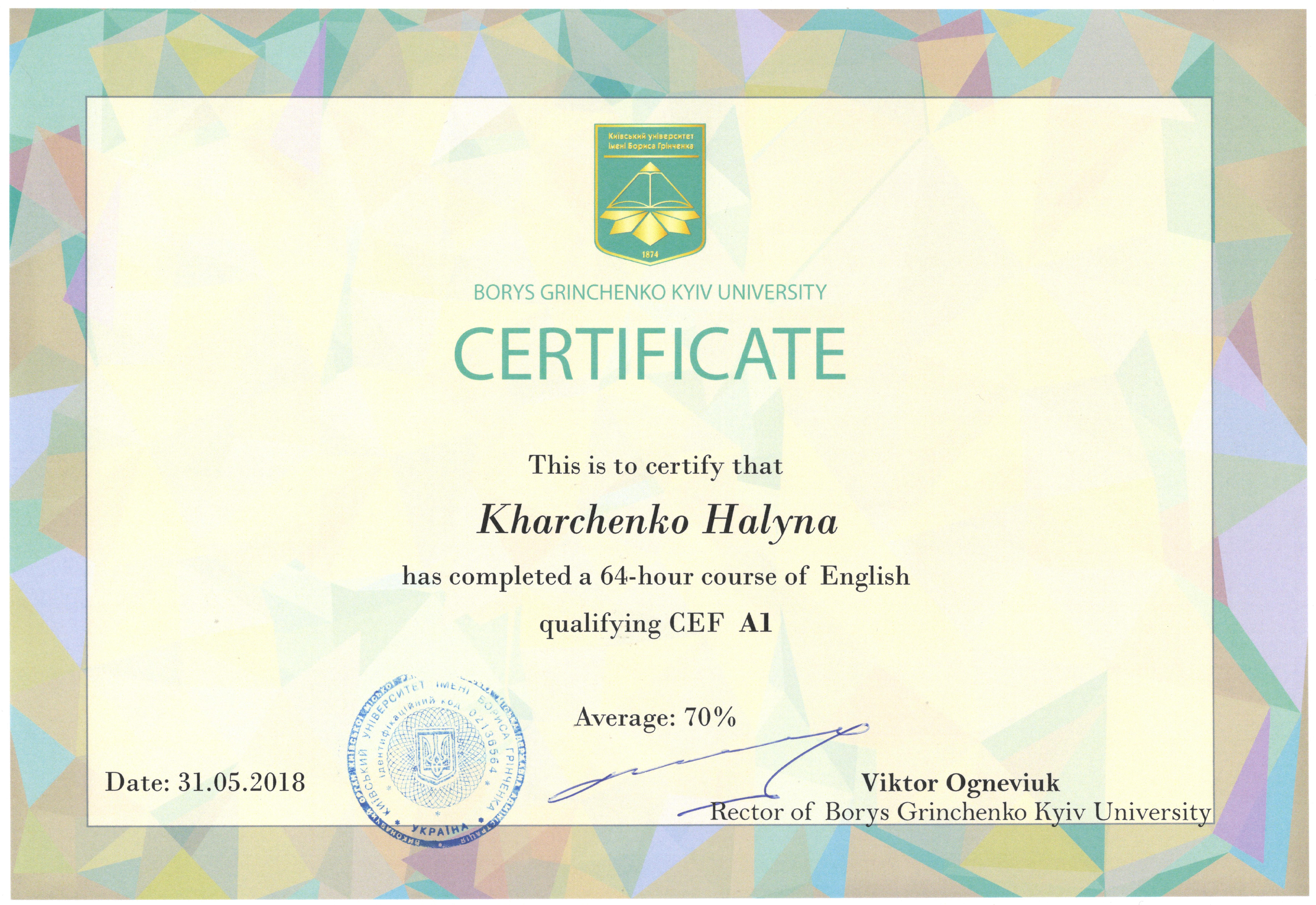 | 3241 | Сертифікат володіння англійською мовою А1 | слухач курсів з англійської мови | Київський університет ім.Бориса Грінченка |