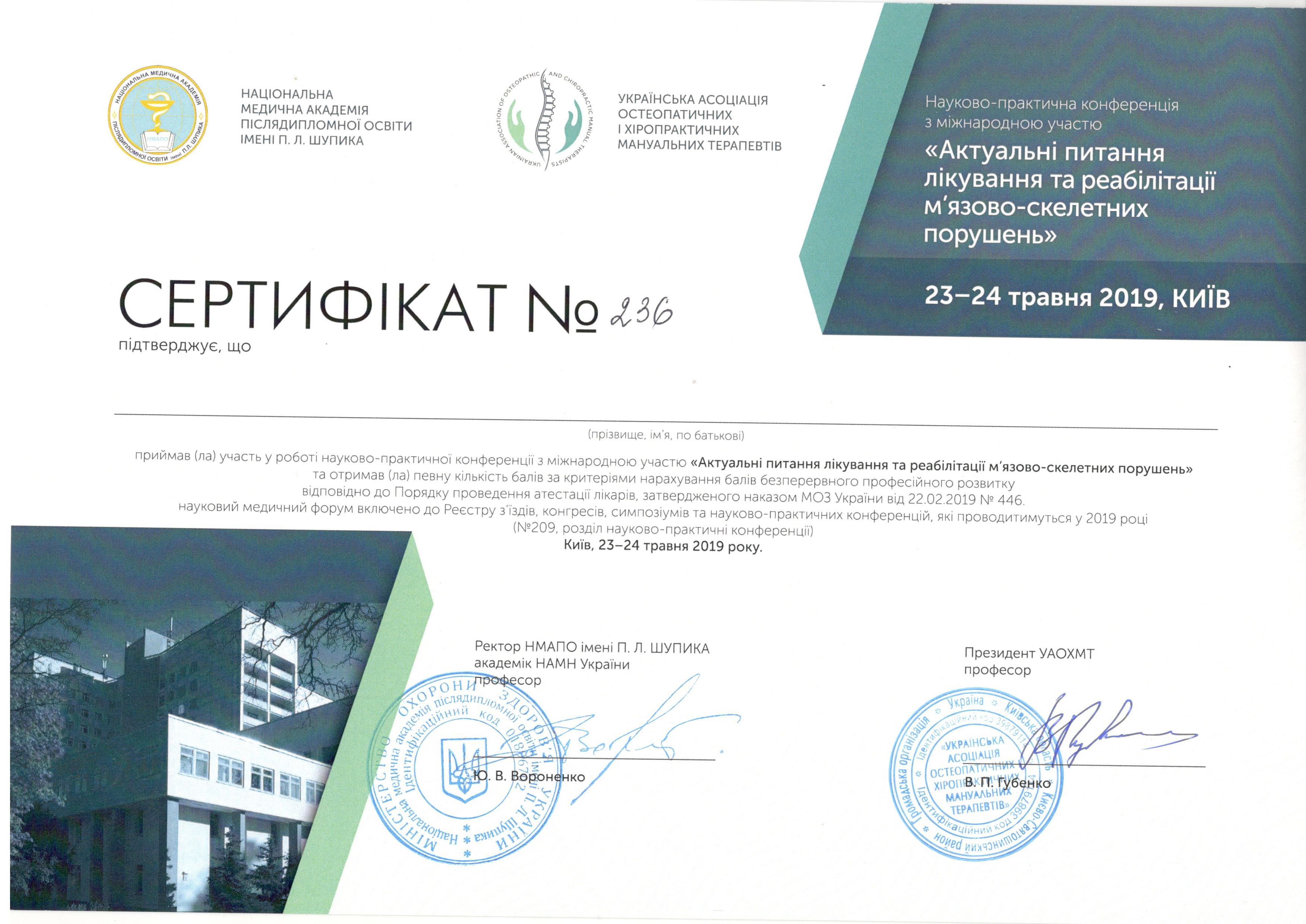 | 5124 | Актуальні питання лікування та реабілітації м'язово-скелетних порушень | учасник міжнародної науково-практичної конференції | м. Київ |