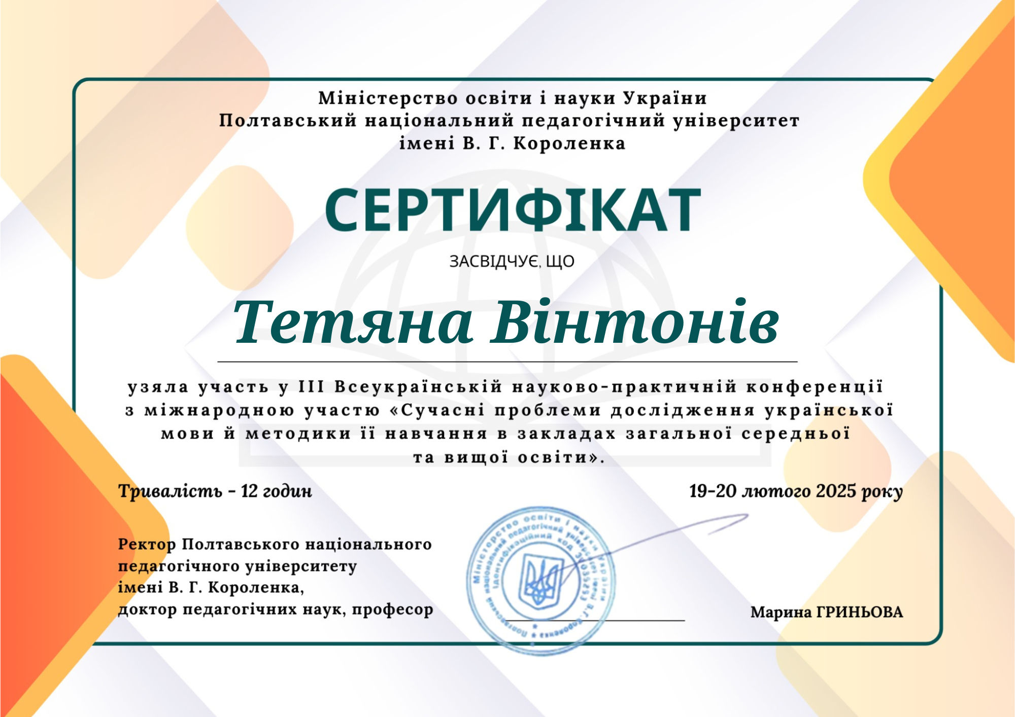 | 11704 | ІІІ Всеукраїнської науково-практичної конференції з міжнародною участю «СУЧАСНІ ПРОБЛЕМИ ДОСЛІДЖЕННЯ УКРАЇНСЬКОЇ МОВИ Й МЕТОДИКИ ЇЇ НАВЧАННЯ В ЗАКЛАДАХ ЗАГАЛЬНОЇ СЕРЕДНЬОЇ ТА ВИЩОЇ ОСВІТИ» | Особливості викладання української мови для осіб із порушеннями слуху | Полтавський національний педагогічний університет імені В. Г. Короленка |