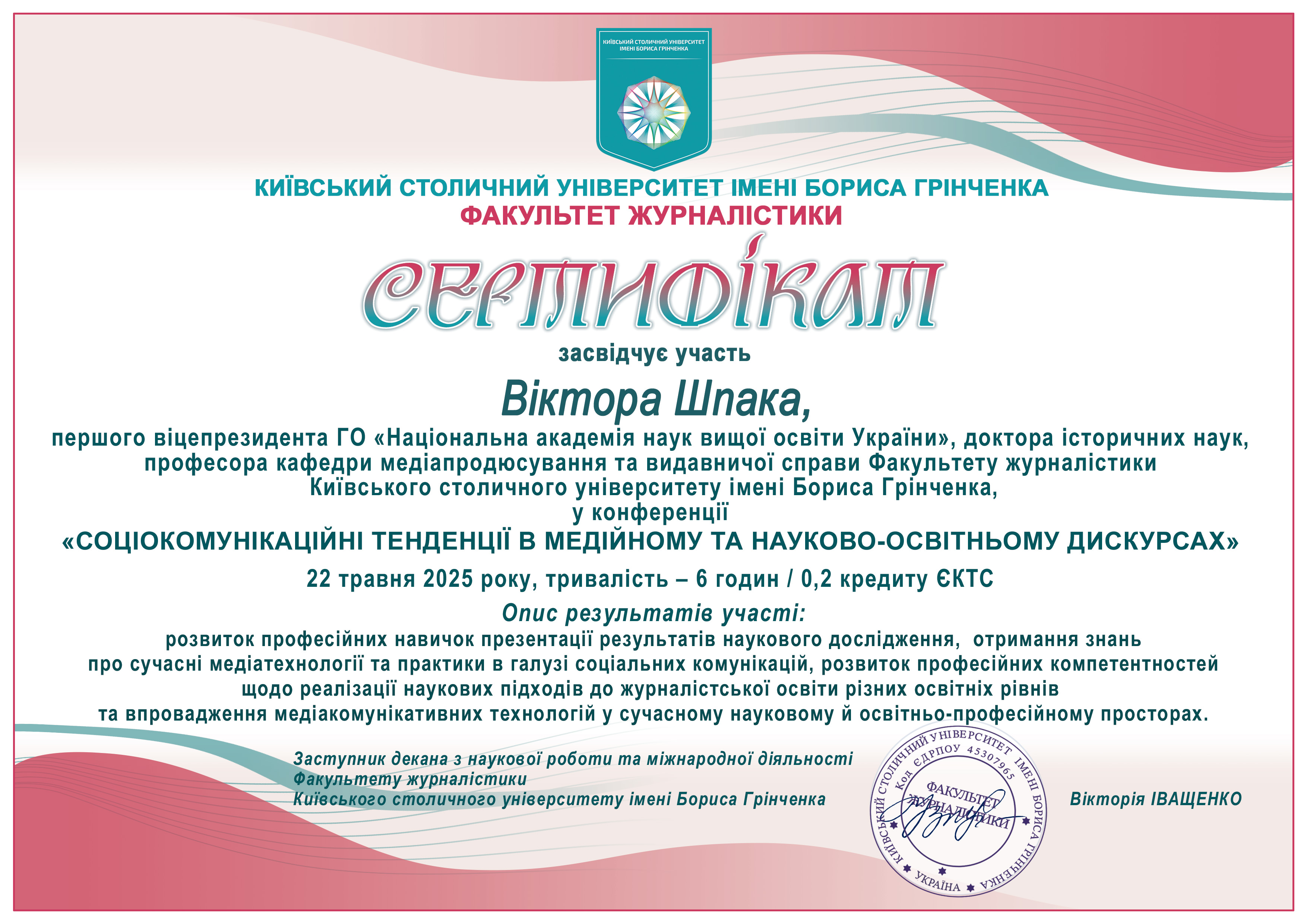 | 370 | Факультет журналістики | Кафедра медіапродюсування та видавничої справи | 80.6 | 2 | 2024 | https://www.researchgate.net/profile/Viktor_Shpak2 |