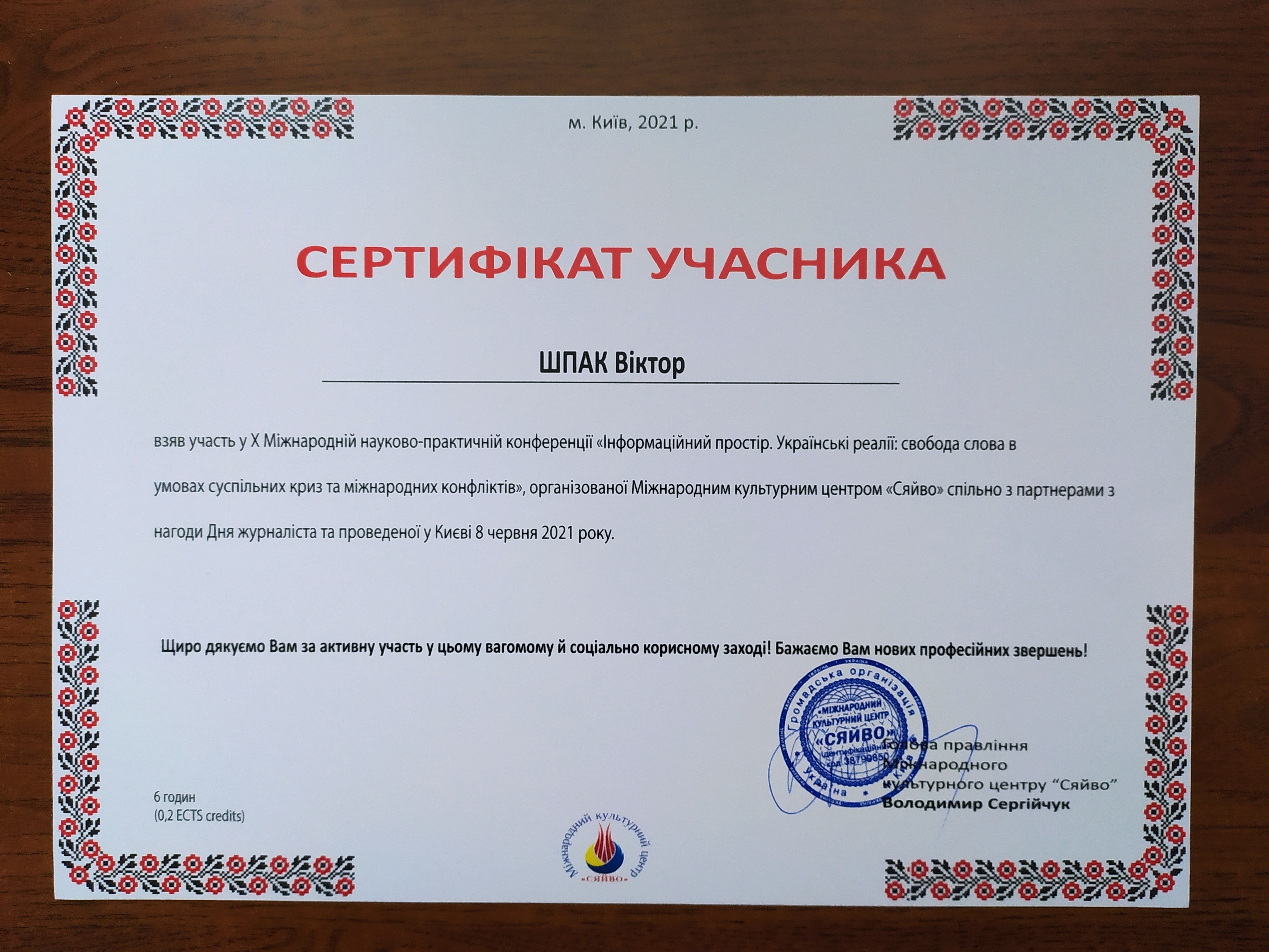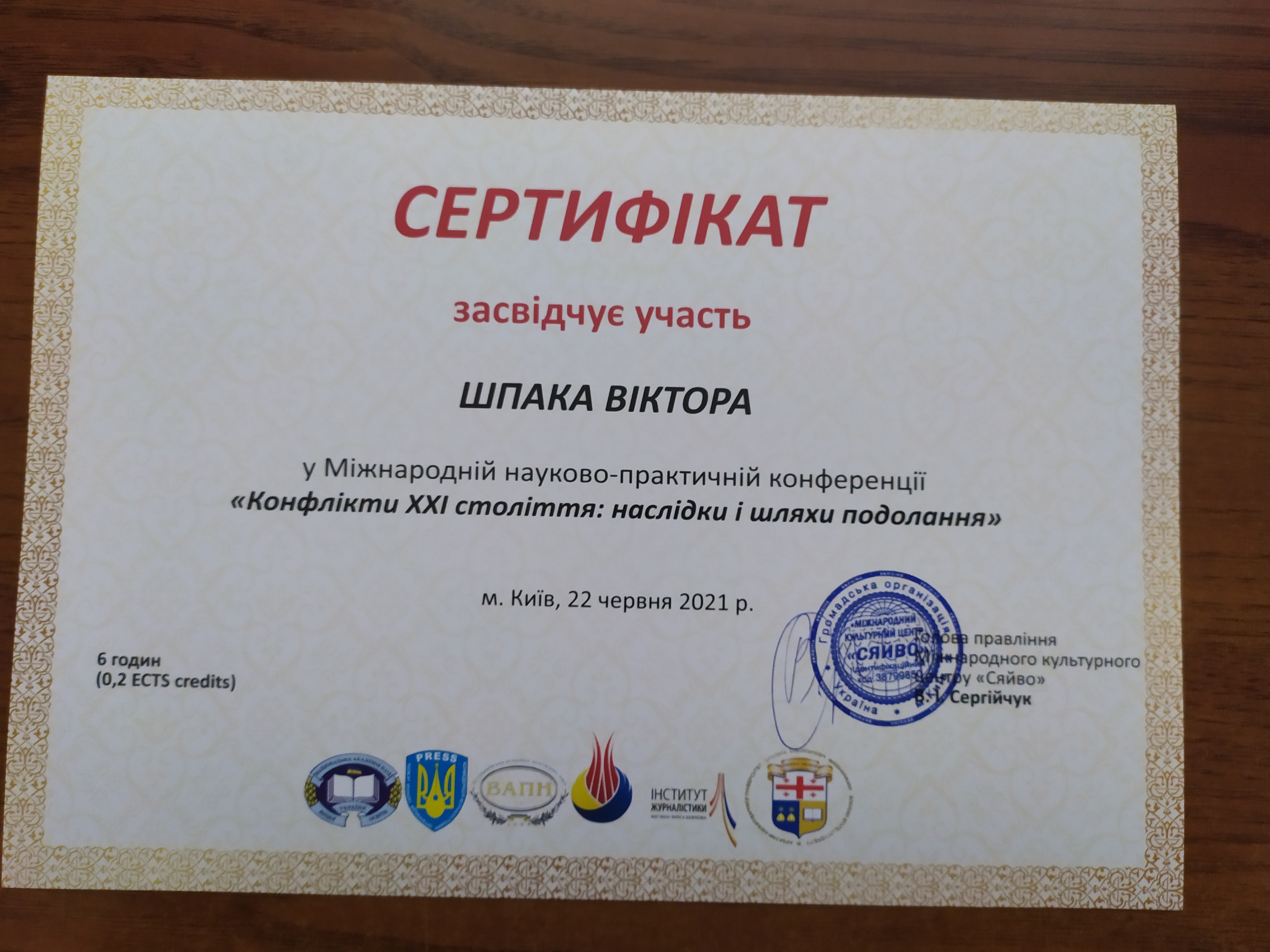 | ID | Назва | Тема доповіді | Місце проведення | Документ, що засвідчує | Дата проведення |