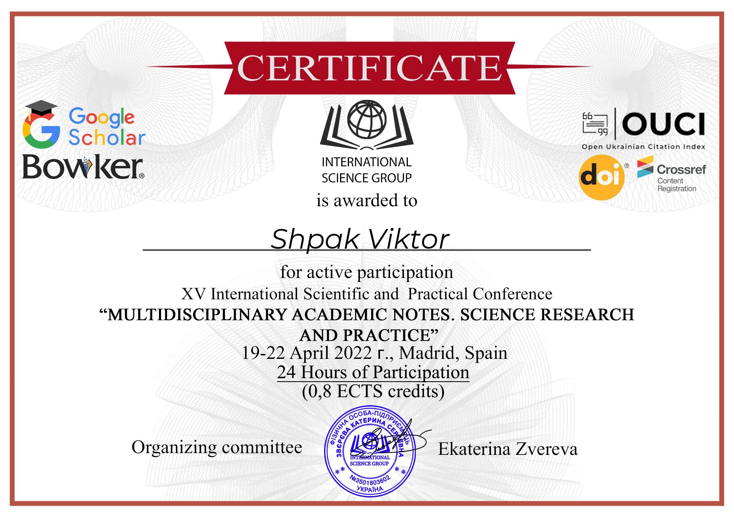 | 7960 | The ХV International Scientific and Practical Conference «Multidisciplinary academic notes. Science research and practice», | Civilized media reform | Madrid, Spain |