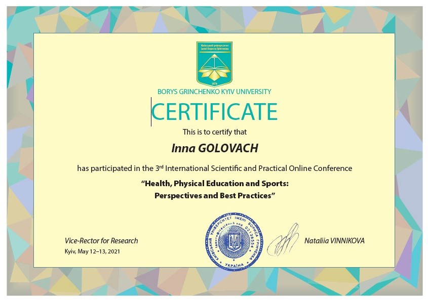 | 2240 | V Всеукраїнська науково-практична конференція "Фізичне виховання, спорт та здоров'я людини: досвід, проблеми, перспективи" (у циклі Анохінських читань) | Формування мотивації досягнення учнів старшого шкільного віку | КУБГ |