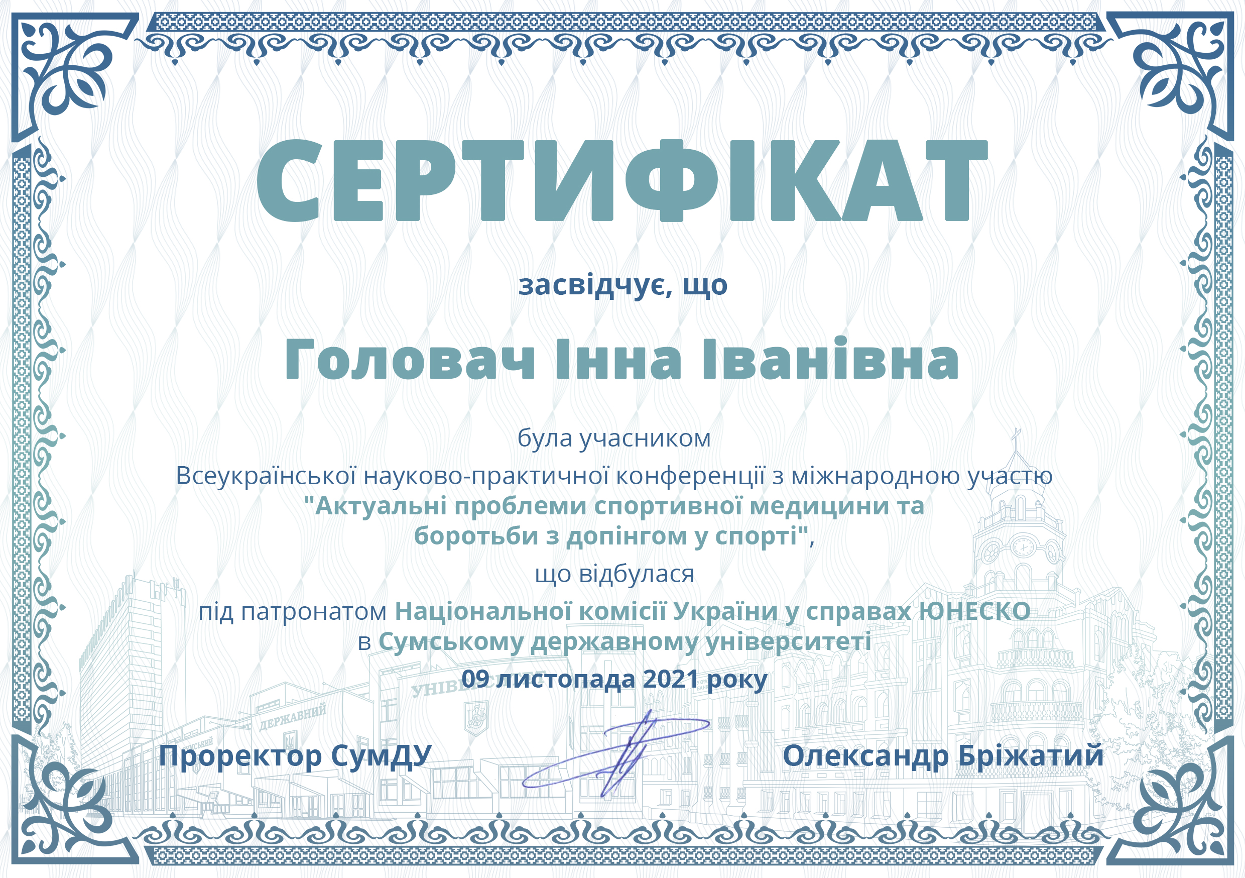 | 7332 | Актуальні проблеми спортивної медицини та боротьби з допінгом в спорті | • Профілактика спортивного травматизму | м. Суми, вул. Римського-Корсакова, 2, Сумський державний університет |