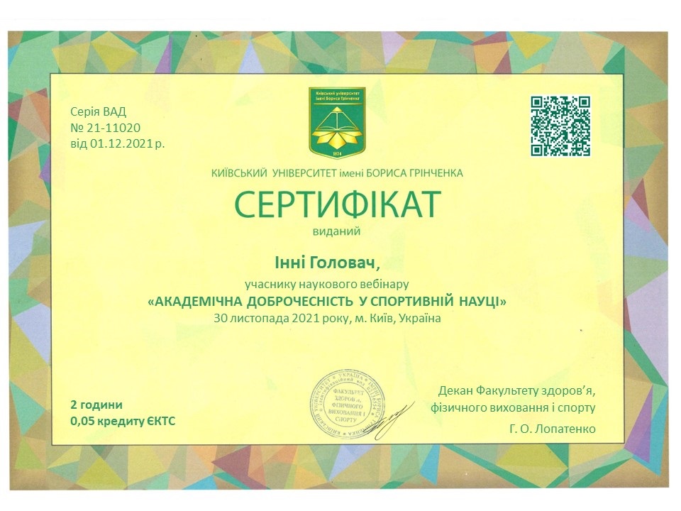 | 7641 | Науковий вебінар "Академічна доброчесність у спортивній науці" | Академічна доброчесність | м. Київ, КУБГ |