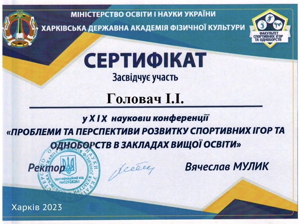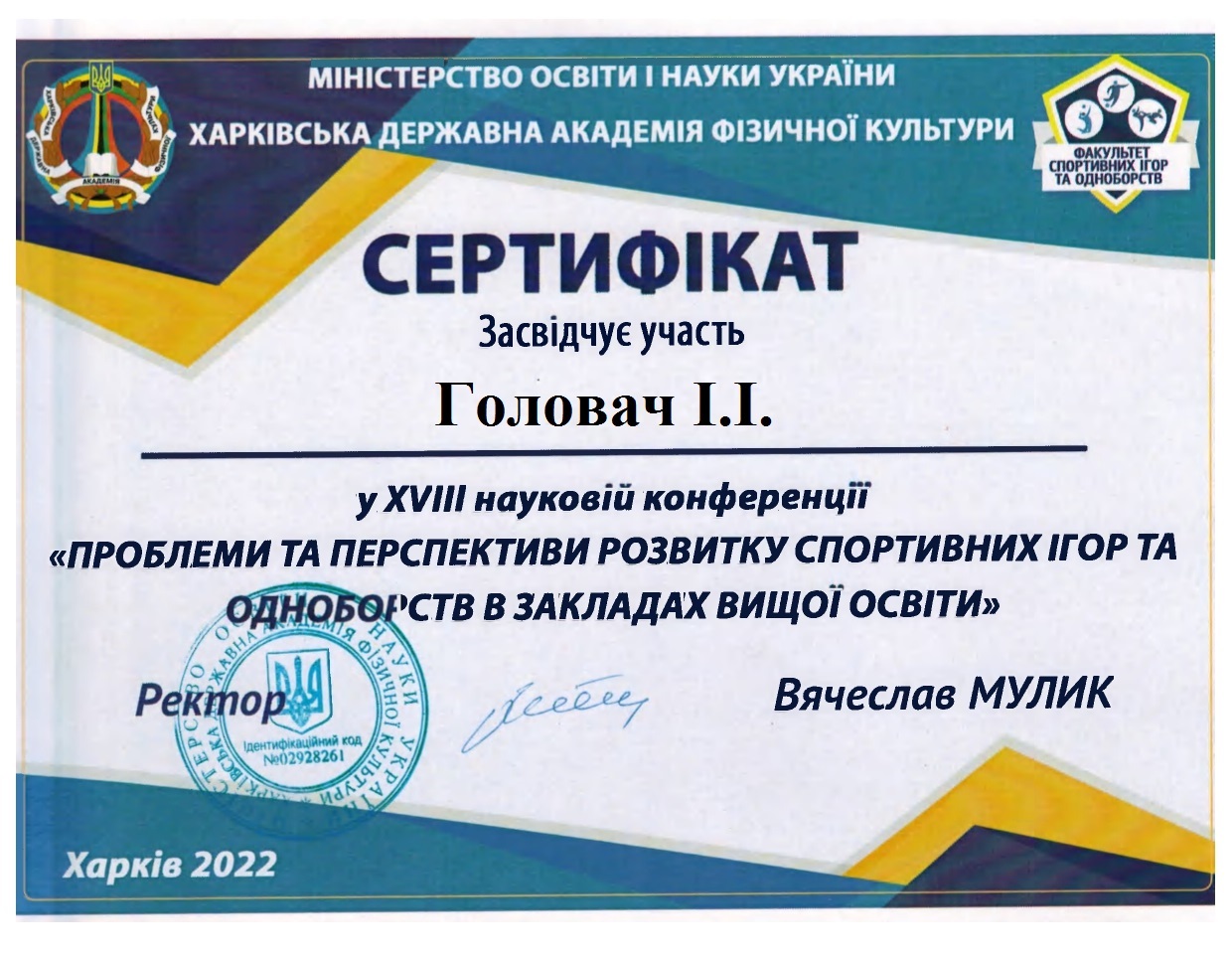 | 7923 | XVIII наукова конференція " Проблеми та перспективи розвитку спортивних ігор та одноборств в закладах вищої освіти" | Вплив занять хортінгом на рівень рухових якостей дітей 10-11 років | м. Харків |
