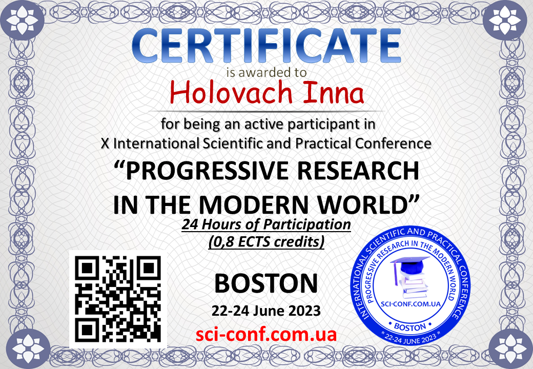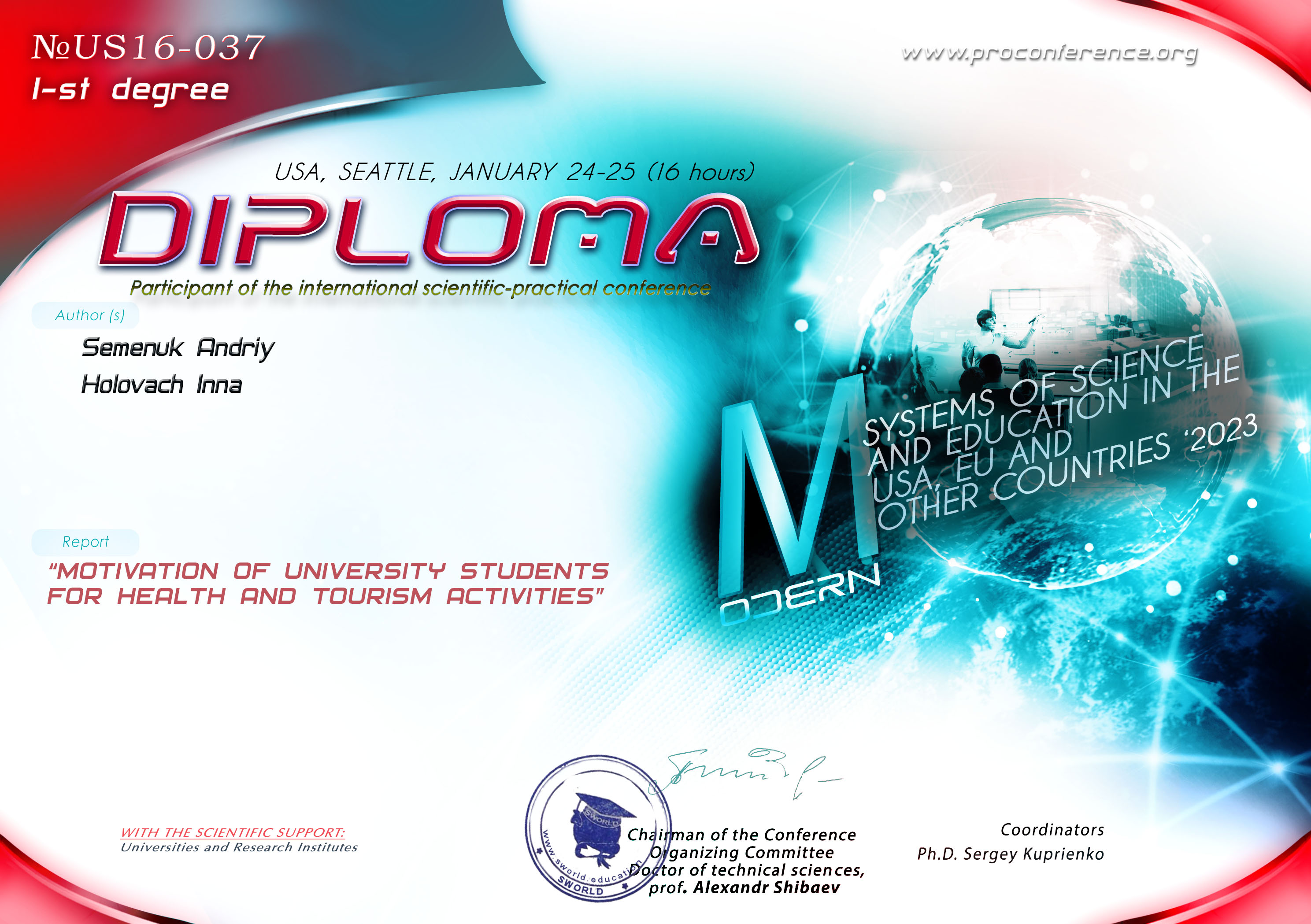 | 8920 | Modern systems of science and education in the USA, EU and other countries ‘2023 | МОТИВАЦІЯ СТУДЕНТІВ ЗАКЛАДІВ ВИЩОЇ ОСВІТИ ДО ЗАНЯТЬ ОЗДОРОВЧОЮ ТУРИСТИЧНОЮ ДІЯЛЬНІСТЮ | USA, Seattle |