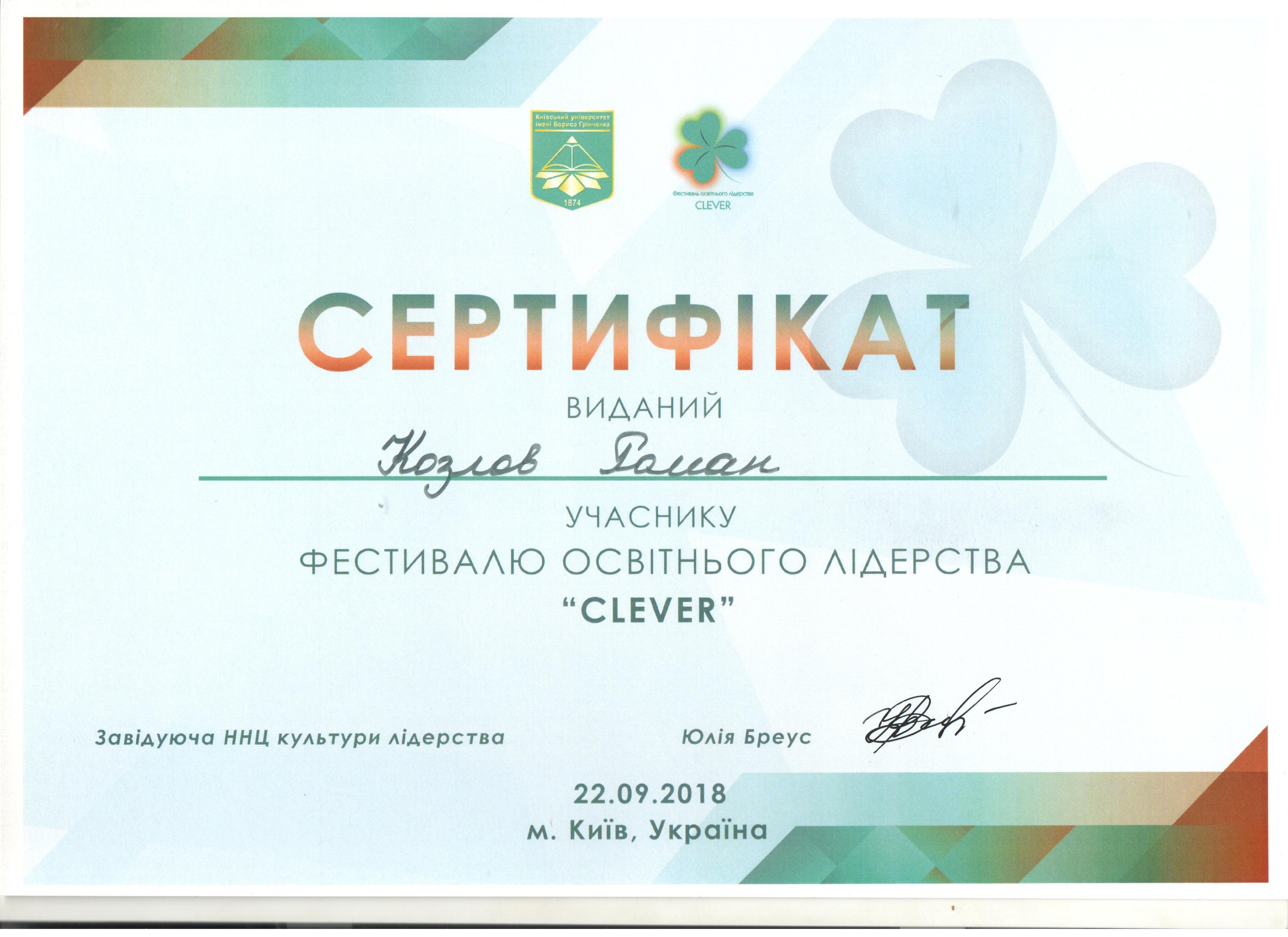 | 3295 | Фестиваль освітнього лідерства «Clever» | Участь у тренінгах | Київський університет імені Бориса Грінченка |