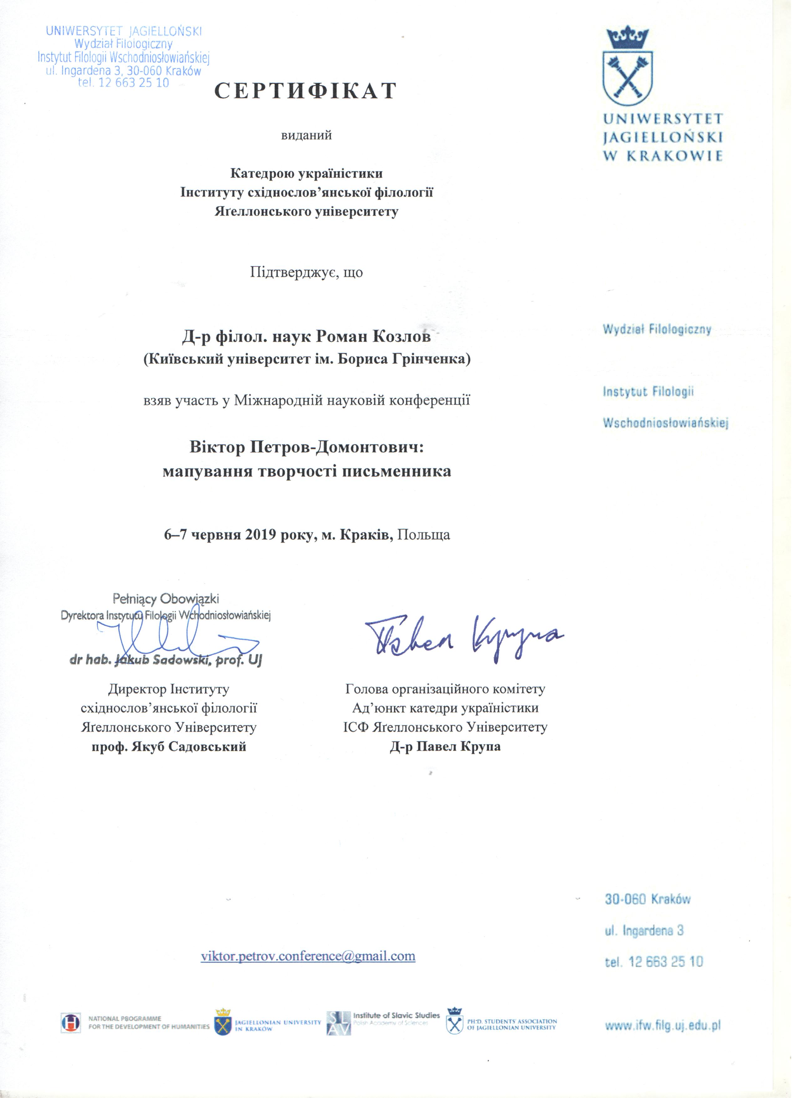 | 4302 | Віктор Петров-Домонтович: мапування творчості письменника | Концепт theatrum mundi в наукових есеях Віктора Петрова | Краків, Польща |