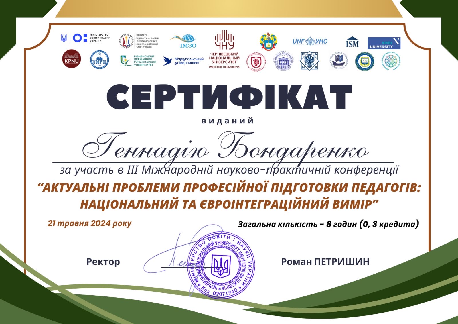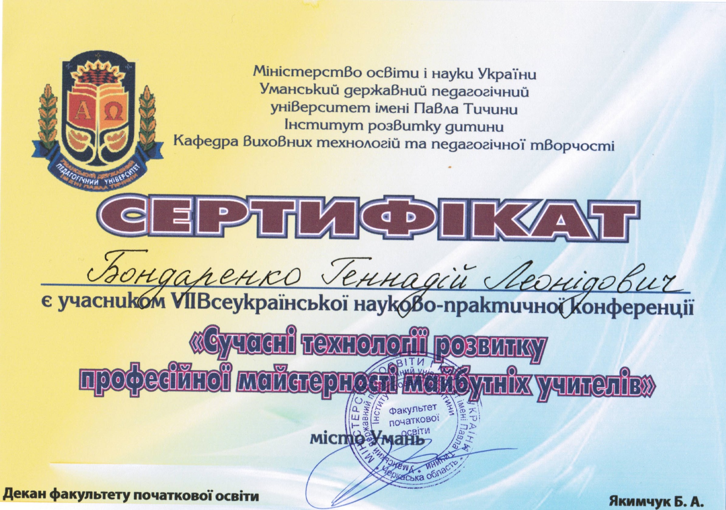 | 128 | Факультет педагогічної освіти | Кафедра початкової освіти | 108.2 | 1 | 2024 | https://www.researchgate.net/profile/Hennadii_Bondarenko |