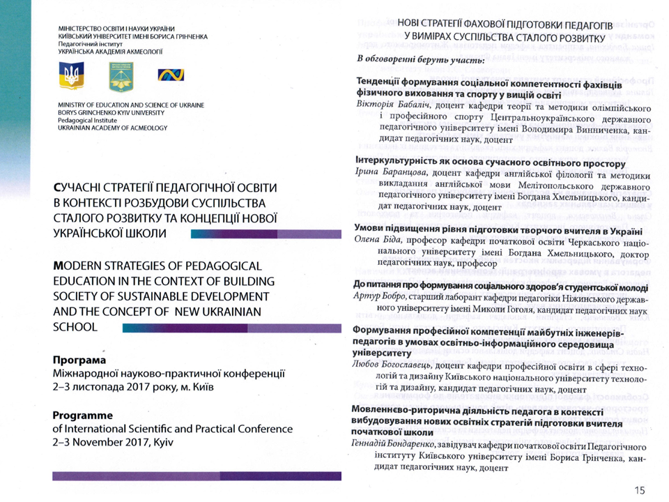 | 2352 | Міжнародна науково-практична конференція "Сучасні стратегії педагогічної освіти в контексті розбудови суспільства сталого розвитку та концепції нової української школи" | Мовленнєво-риторична діяльність педагога в контексті вибудовування нових освітніх стратегій підготовки вчителя початкової школи | м. Київ, Київський університет імені Бориса Грінченка |