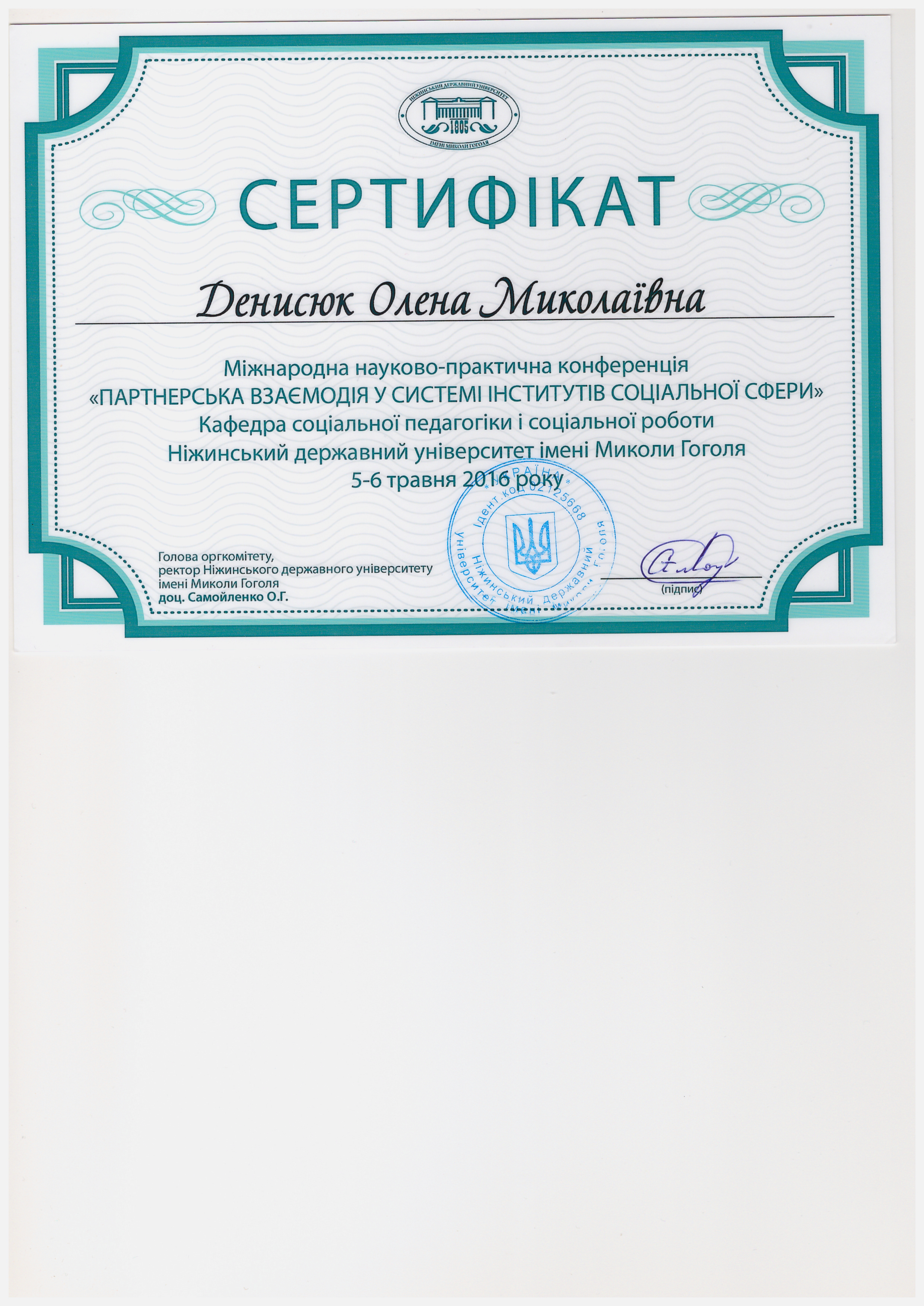 | 1269 | Партнерська взаємодія у системі інститутів соціальної сфери | Підготовка фахівців соціальної сфери до здійснення соціально-педагогічної підтримки батьків, які виховують дітей з інвалідністю | Ніжин |