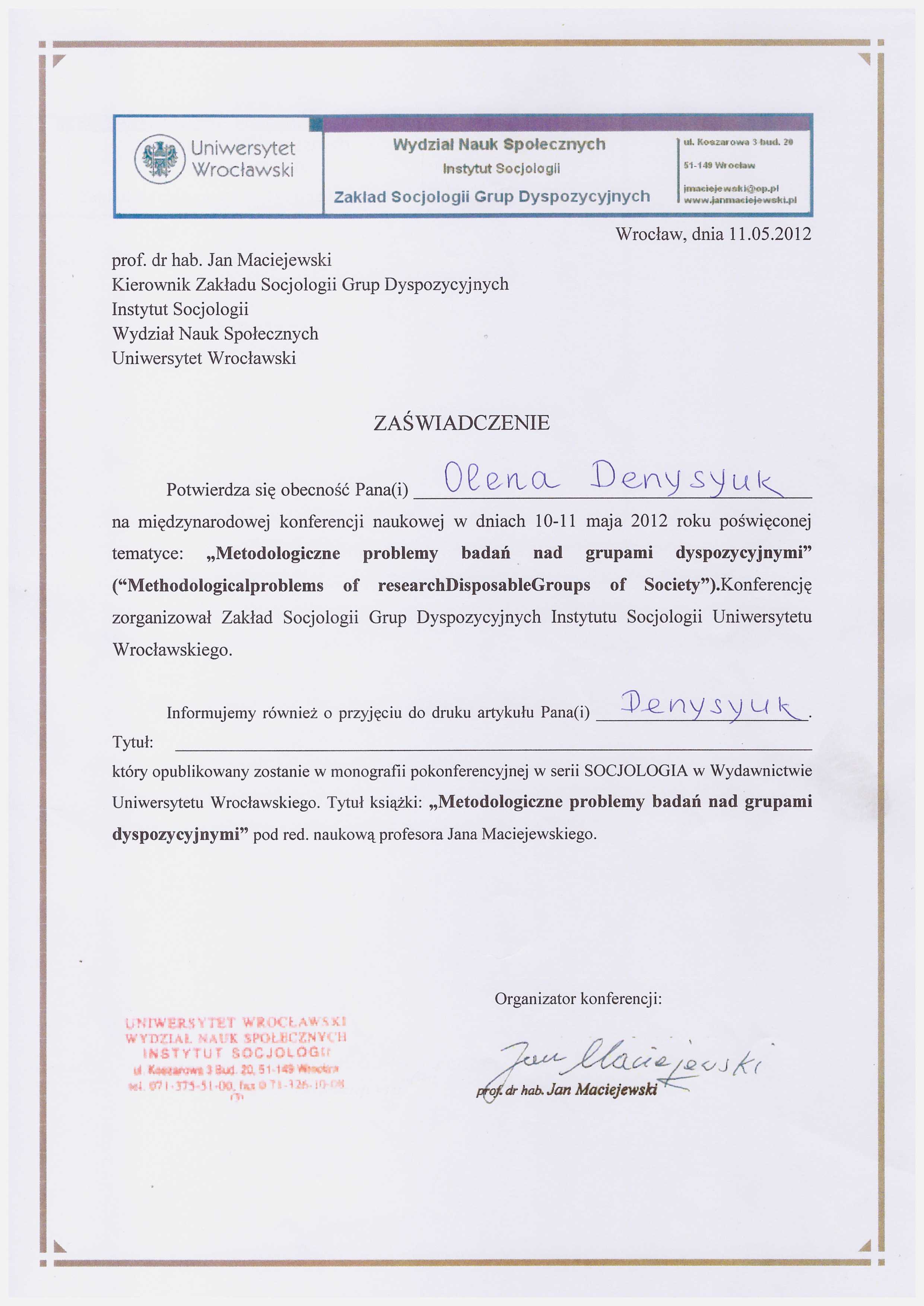 | 183 | Miedzynarodowej Konferencji Naukowej | Social and pedagogical work with families that ensure the safety of their life activities. | Wroclaw, Poland |