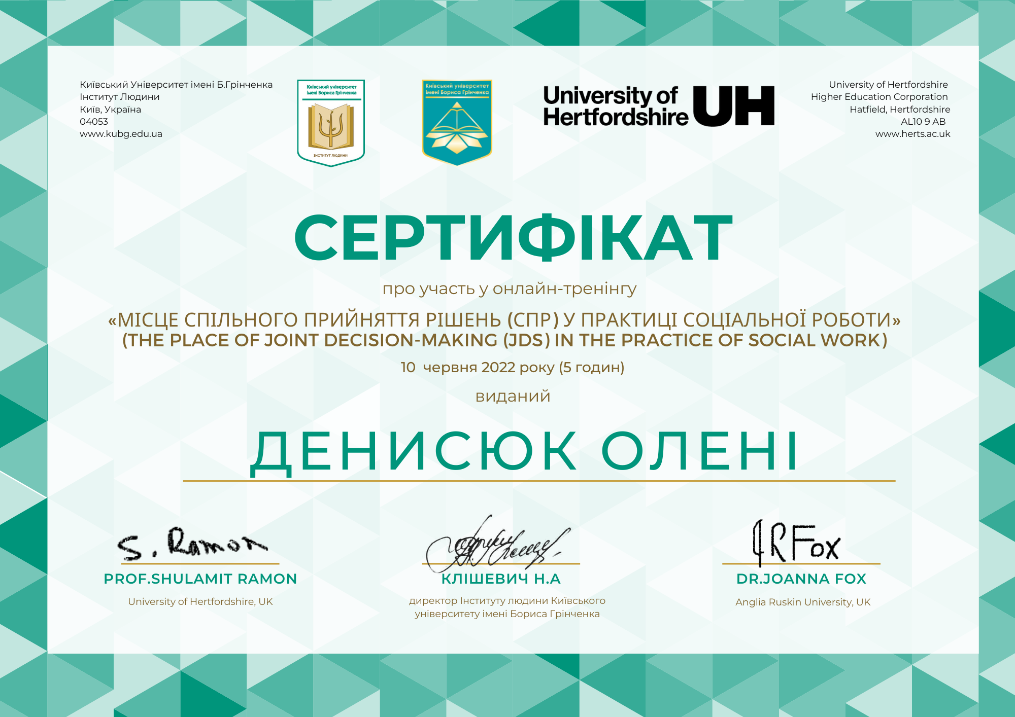 | 8204 | Місце спільного прийняття рішень (СПР) у практиці соціальної роботи | учасниця тренінгу | онлайн (за Київським часом) |