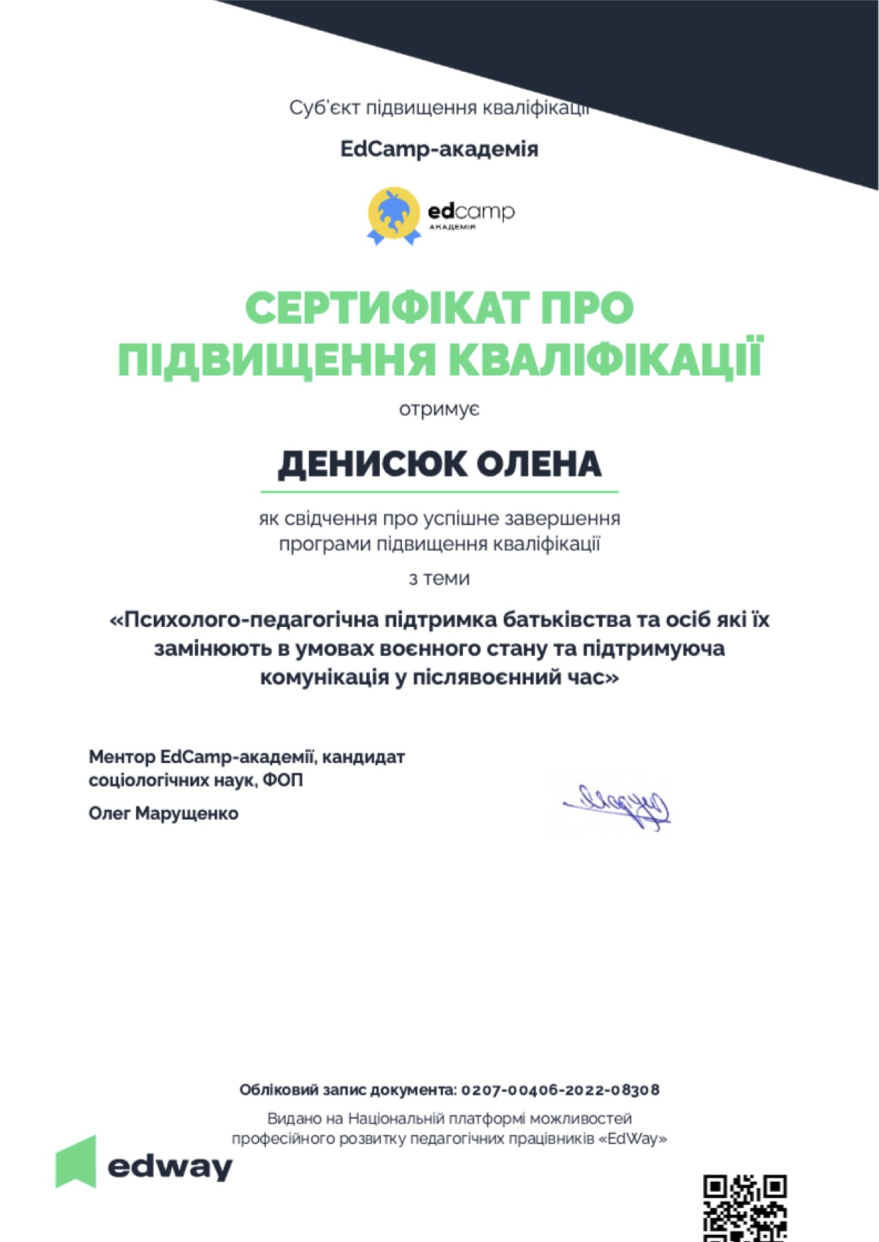 | 8247 | «Психолого-педагогічна підтримка батьківства та осіб які їх замінюють в умовах воєнного стану та підтримуюча комунікація у післявоєнний час» | учасниця програми | онлайн |