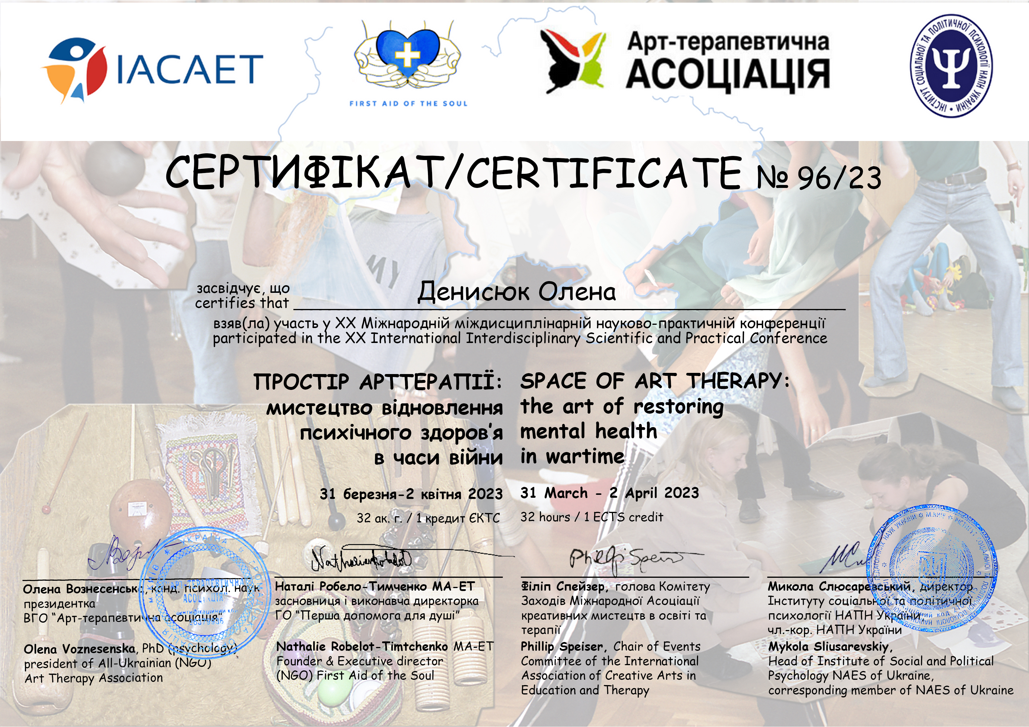| 8205 | ХІХ Міжнародна міждисциплінарна науково-практична конференція "Простір арттерапії: місце особистості в часи суспільних трансформацій" | учасниця конференції | онлайн (за Київським часом) | document.pdf | |