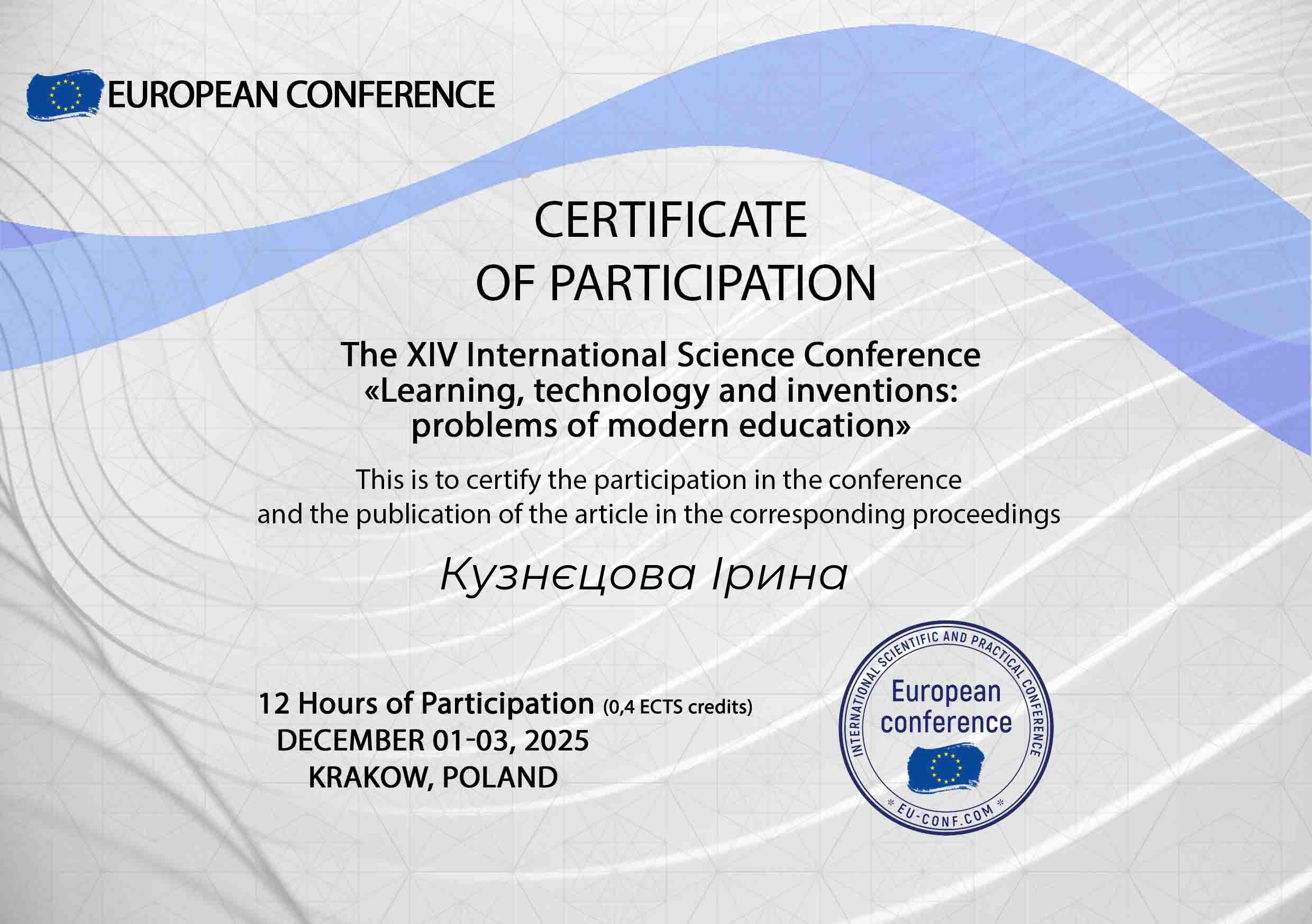 | ID | ПІБ студента | Інститут / факультет | Курс (період навчання) | Назва заходу | Місце проведення заходу | Рік | Тип заходу | Призове місце | Документ, що засвідчує |