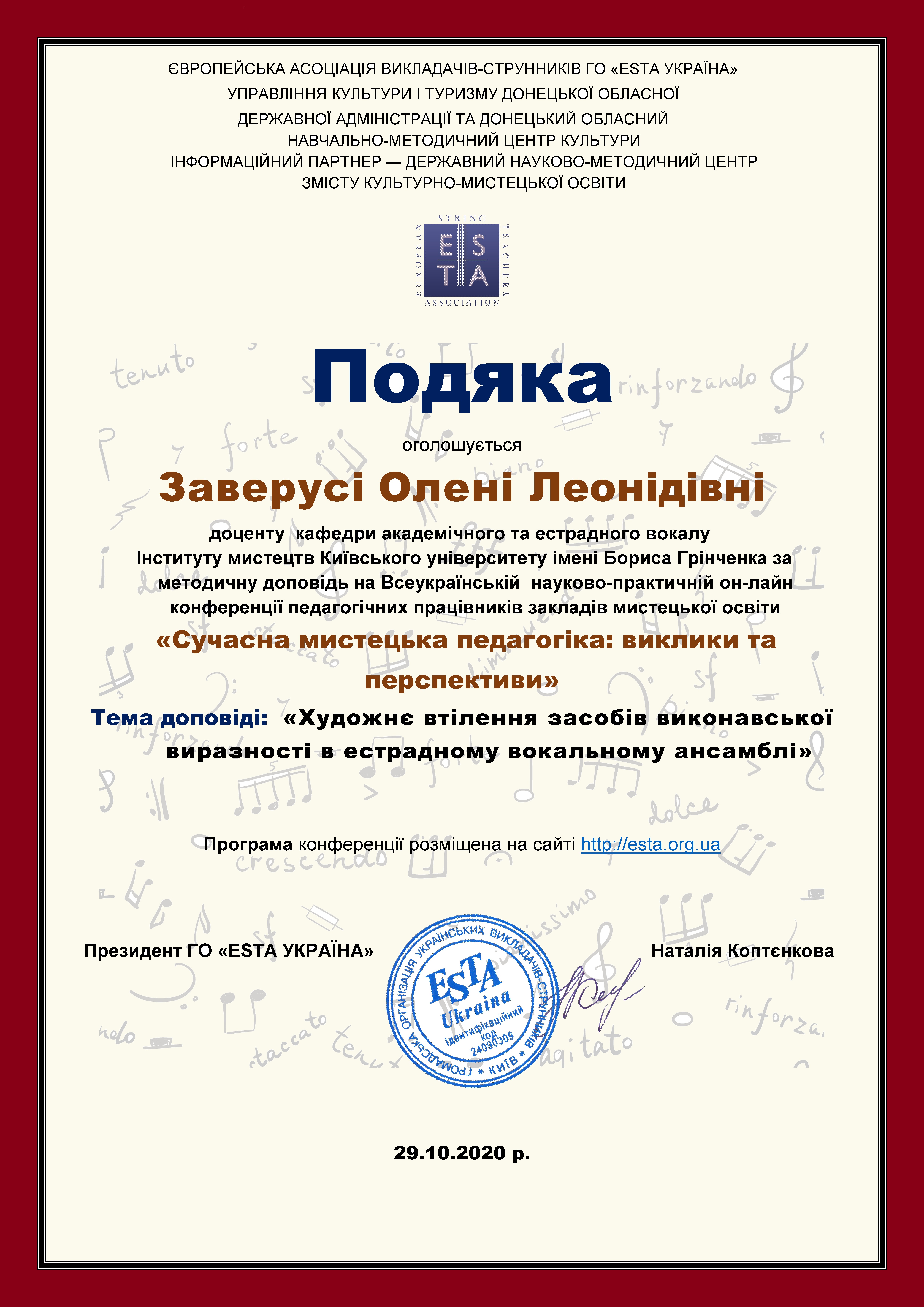 | 408 | Факультет музичного мистецтва і хореографії | Кафедра академічного та естрадного вокалу | Сценарист | IIІ Всеукраїнський двотуровий Фестиваль-конкурс вокального мистецтва Vocal Seasons | Україна, Київ | 2023 |