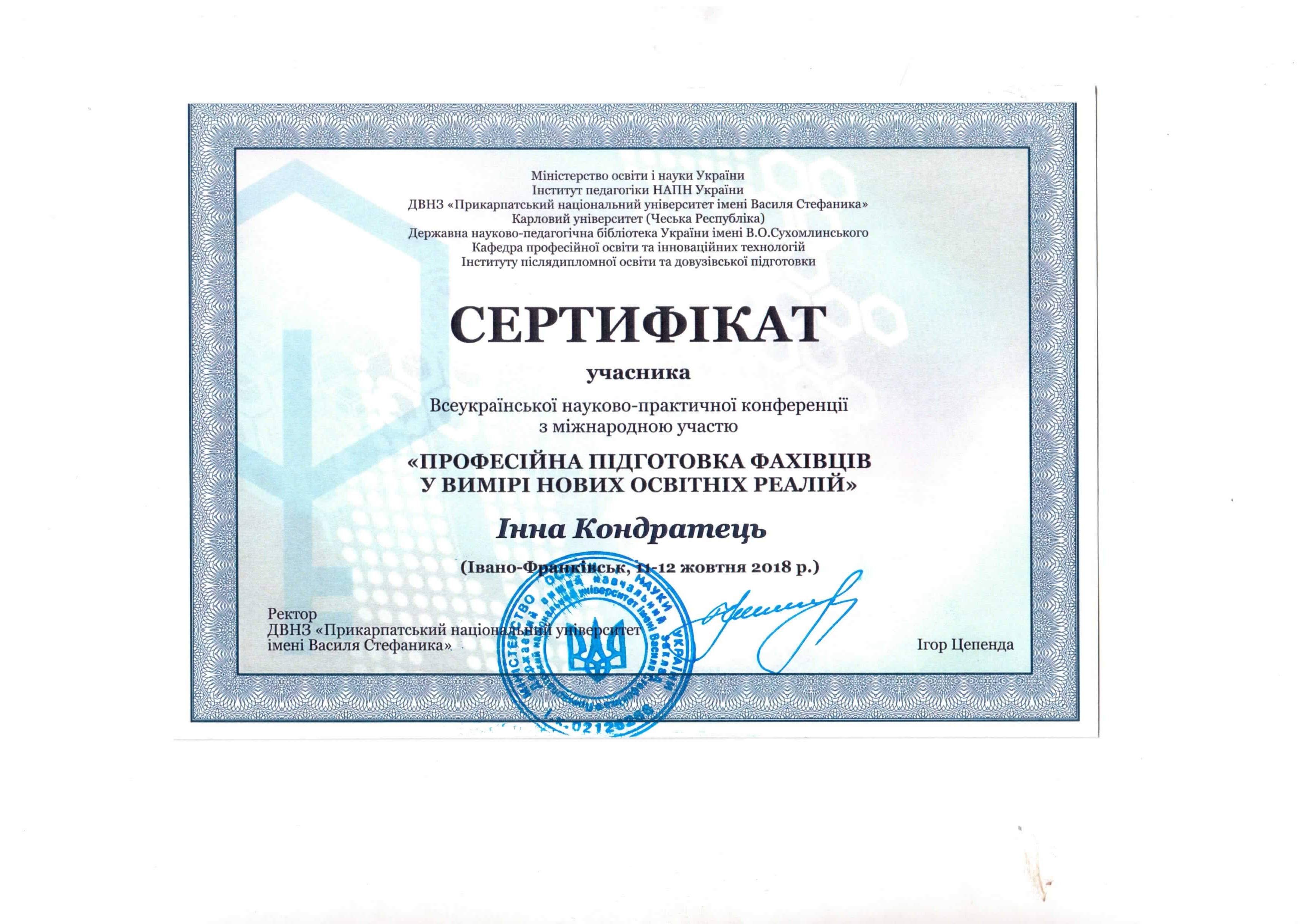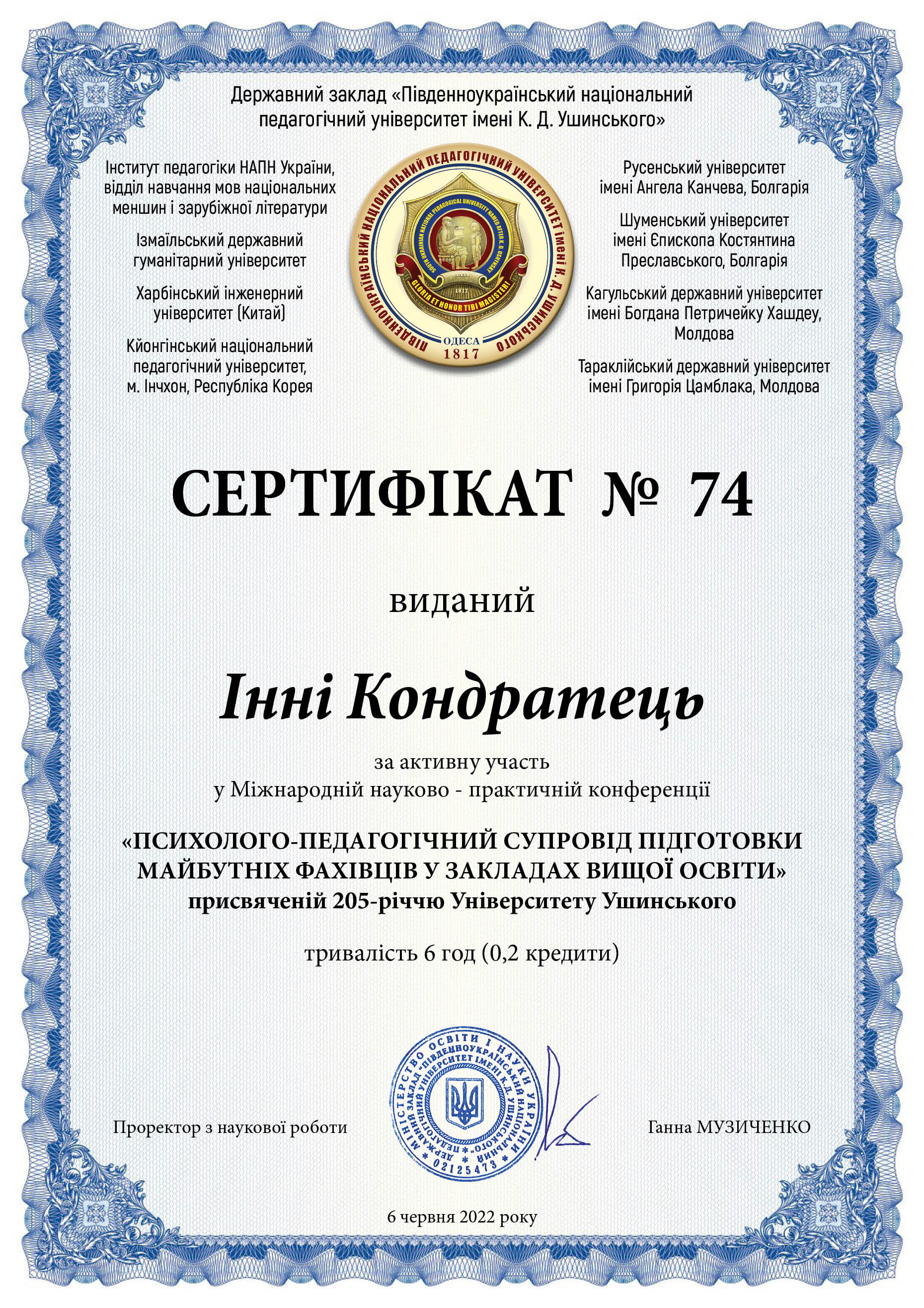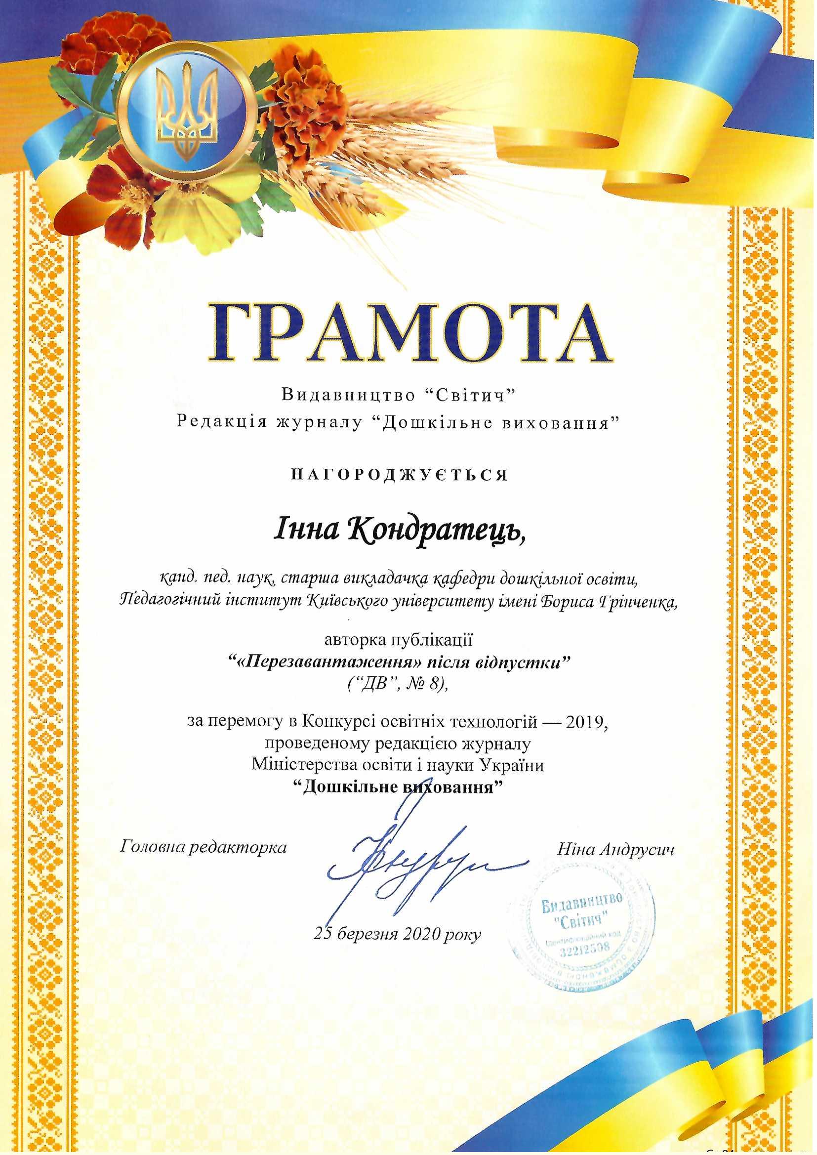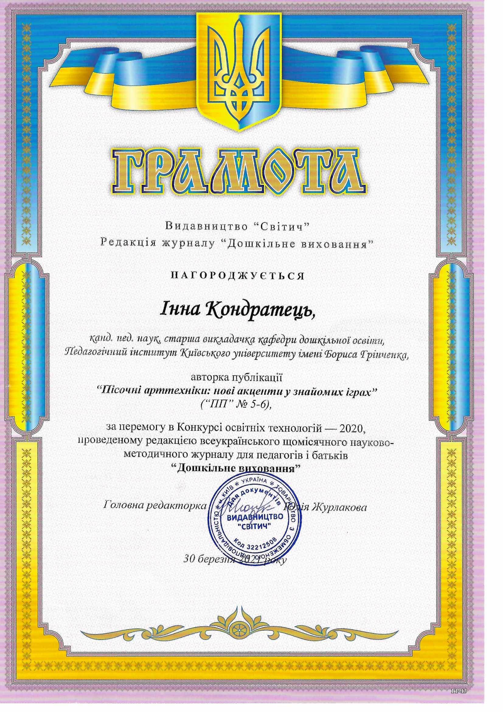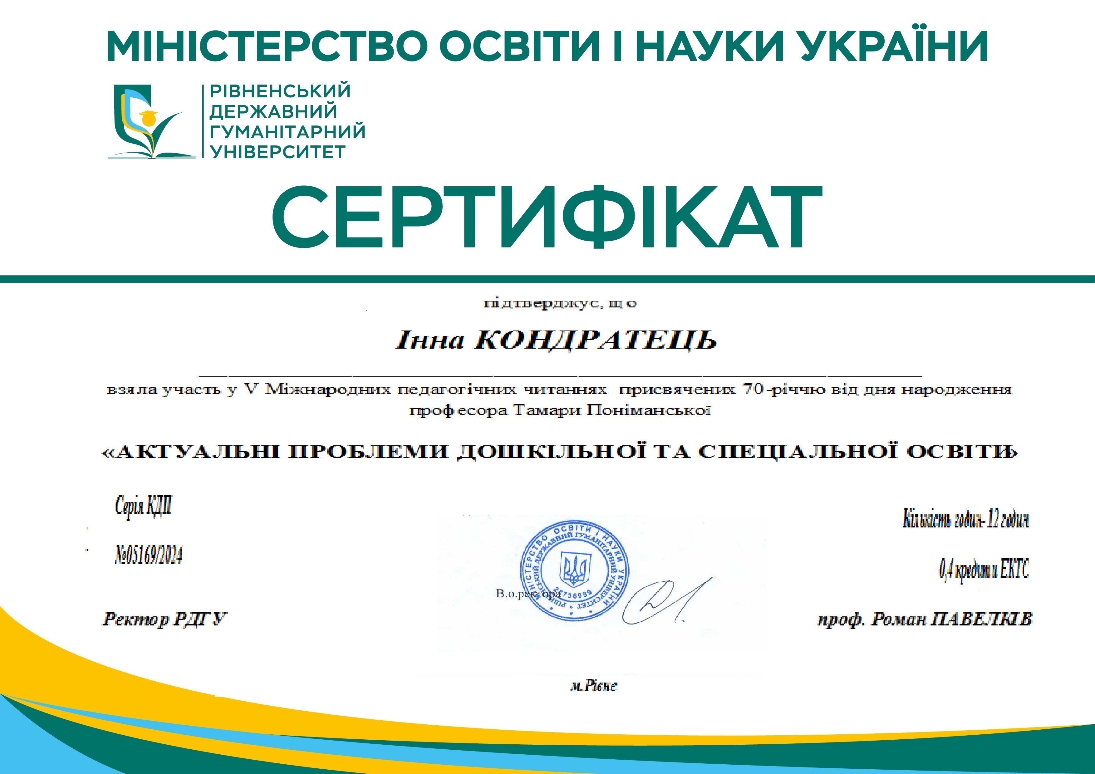 | 181 | Факультет педагогічної освіти | Кафедра дошкільної освіти | 24 | 2 | 2024 | https://www.researchgate.net/profile/Inna_Kondratec |