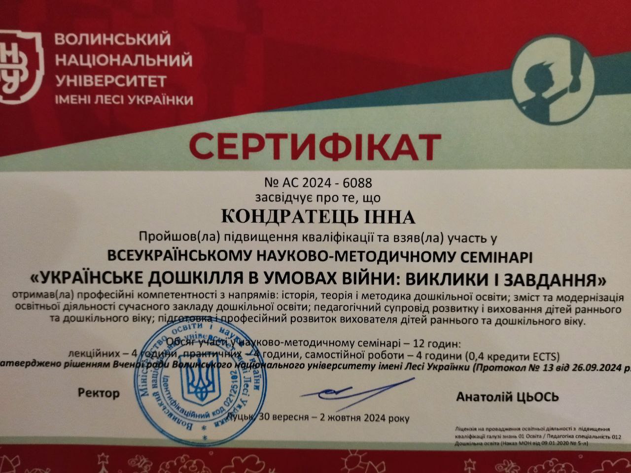 | 11416 | - Всеукраїнський науково-методичний семінар «Українське дошкілля в умовах війни: виклики і завдання | Використання рефлексійних вправ у психолого-педагогічному супроводі з дітьми в умовах війни. | м. Луцьк |