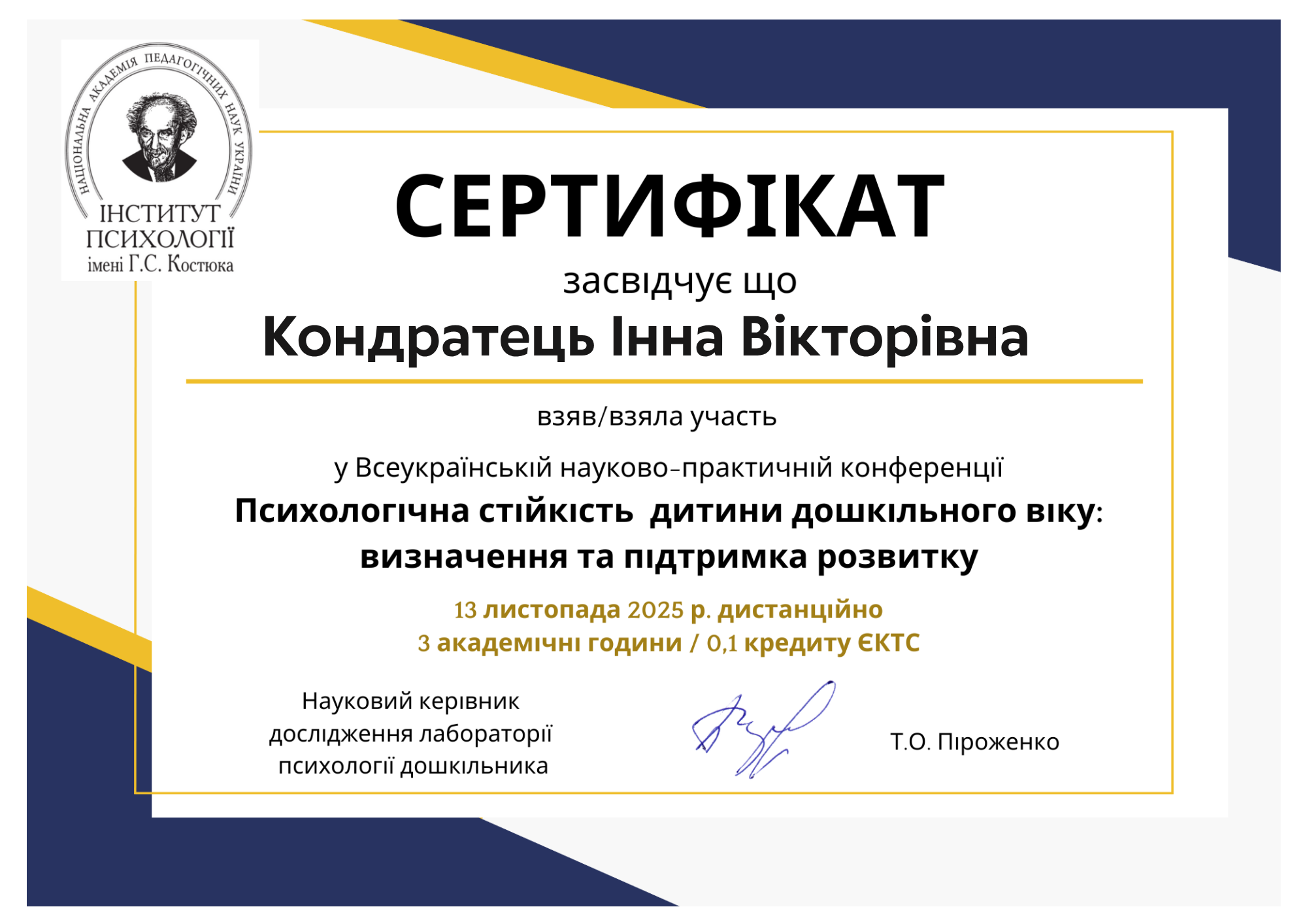| 12504 | Психологічна стійкість дитини дошкільного віку: визначення та підтримка розвитку | Рефлексійні акценти у взаємодії з дітьми раннього і дошкільного віку | Київ |