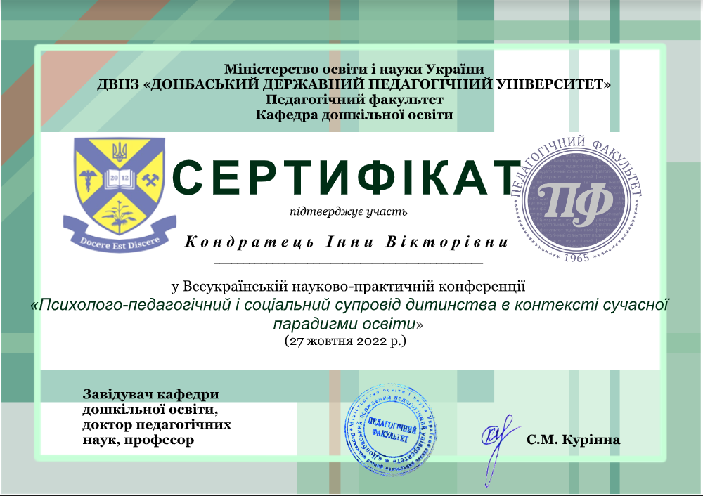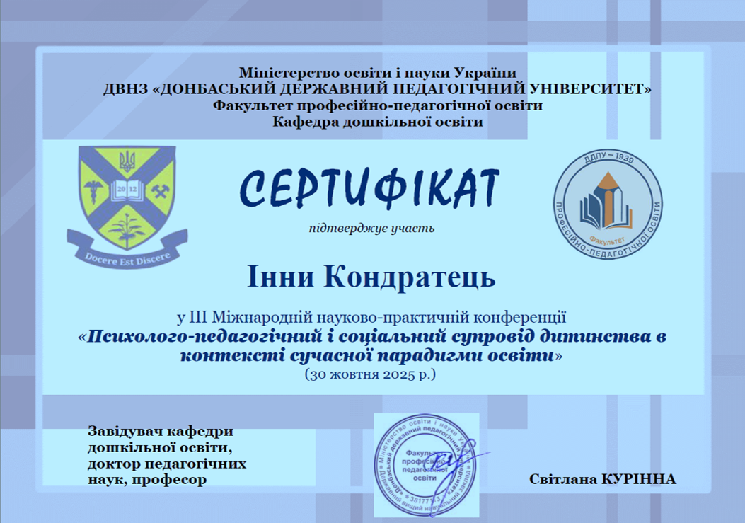 | 8633 | Всеукраїнська науково-практична конференція «ПСИХОЛОГО-ПЕДАГОГІЧНИЙ І СОЦІАЛЬНИЙ СУПРОВІД ДИТИНСТВА В КОНТЕКСТІ СУЧАСНОЇ ПАРАДИГМИ ОСВІТИ» | ПСИХОЛОГО-ПЕДАГОГІЧНИЙ СУПРОВІД МАЙБУТНІХ ВИХОВАТЕЛІВ ЗДО В ПЛОЩИНІ ПЛАНУВАННЯ ТА ОРГАНІЗАЦІЇ РІЗНИХ ФОРМ ВЗАЄМОДІЇ З РОЗВИТКУ МОВЛЕННЯ В ГРУПАХ РАННЬОГО ВІКУ | м. Дніпро |