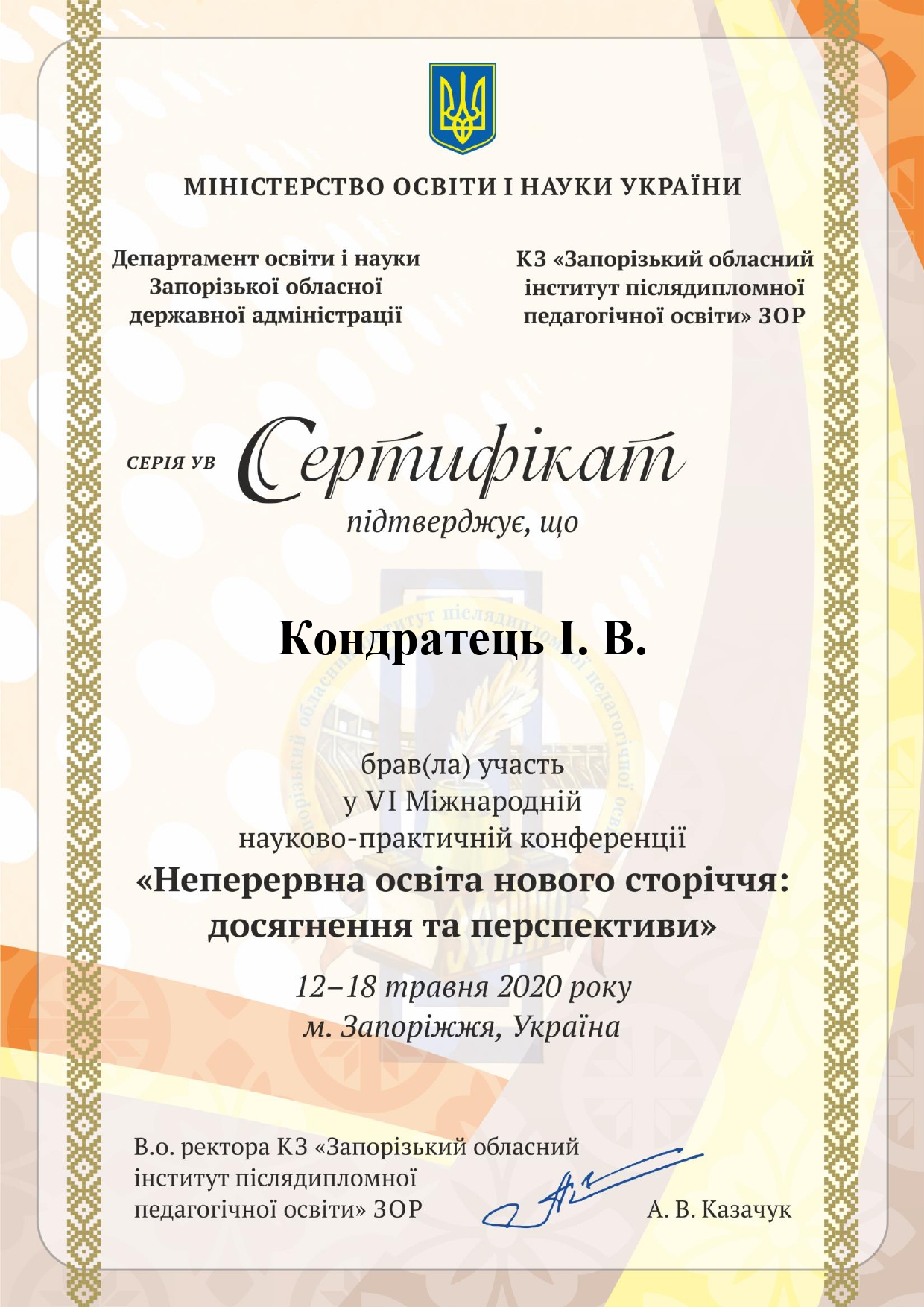 | 11920 | IX International Scientific and Practical Conference SCIENCE IN THE MODERN WORLD: INNOVATIONS AND CHALLENGES | Готовність вихователів і майбутніх вихователів до ролі трансляторів читацької культури в організації літературної діяльності дітей раннього і дошкільного віку | Торонто, Канада |