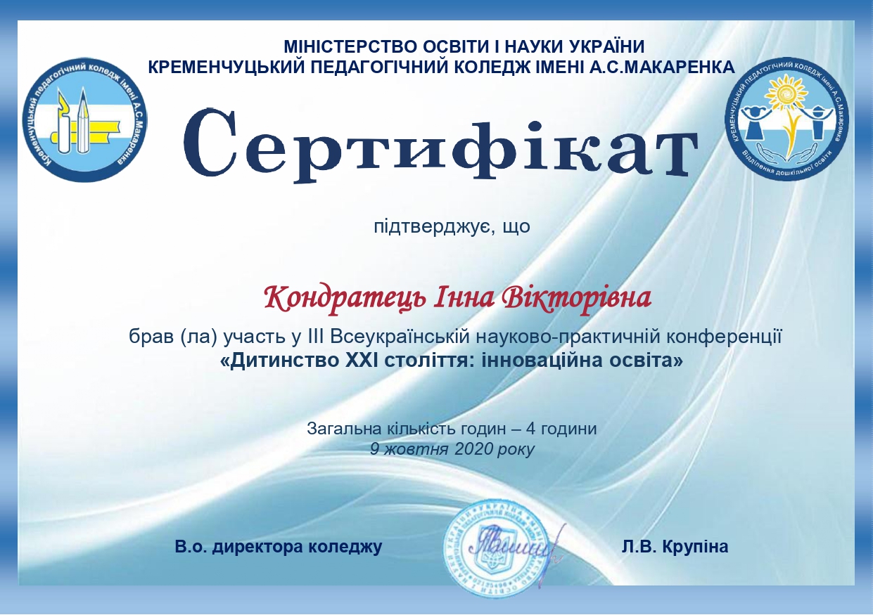 | 5588 | ІІІ Всеукраїнська науково-практична конференція \ | Особливості формування мистецької компетентності майбутніх вихователів в умовах дистанційного навчання | м. Кременчуг |