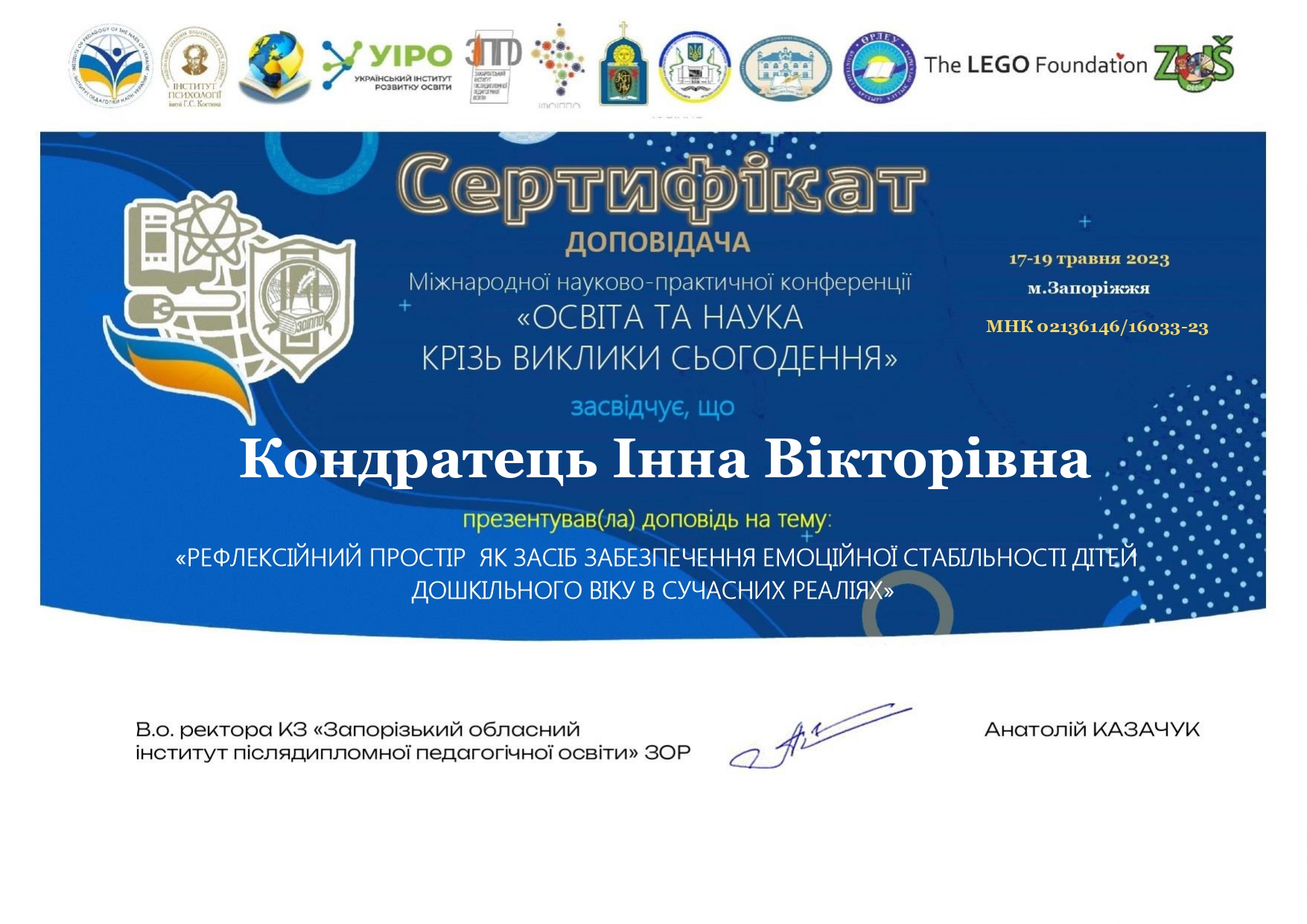 | 9312 | Освіта та наука крізь виклики сьогодення | Рефлексійний простір як засіб забезпечення емоційної стабільності дітей дошкільного віку в сучасних реаліях | Запоріжжя |