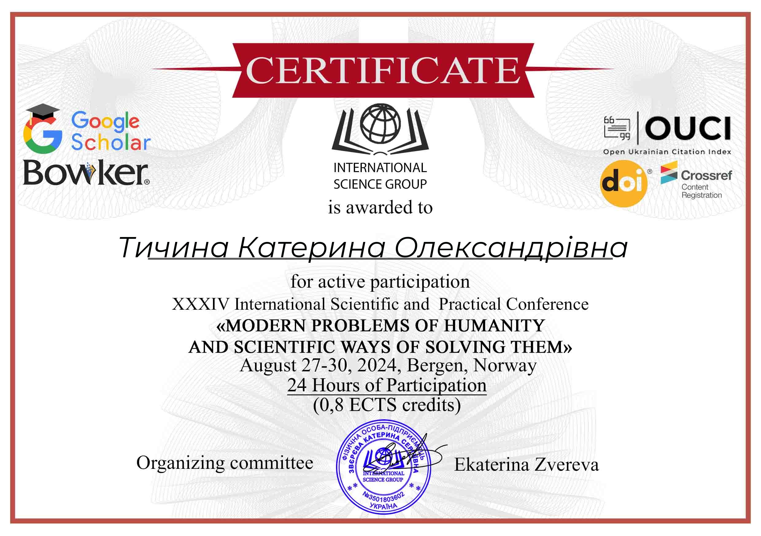 | 10984 | XXXIV Snternational Scientific and Practical Coference @MODERN PROBLEMS OF HUMANITY AND SCIENTIFIC WAYS OF SOLVING THEM@ | Зміст поняття "логопедична допомога" в контексті українського та зарубіжного досвіду | Bergen, Norway |