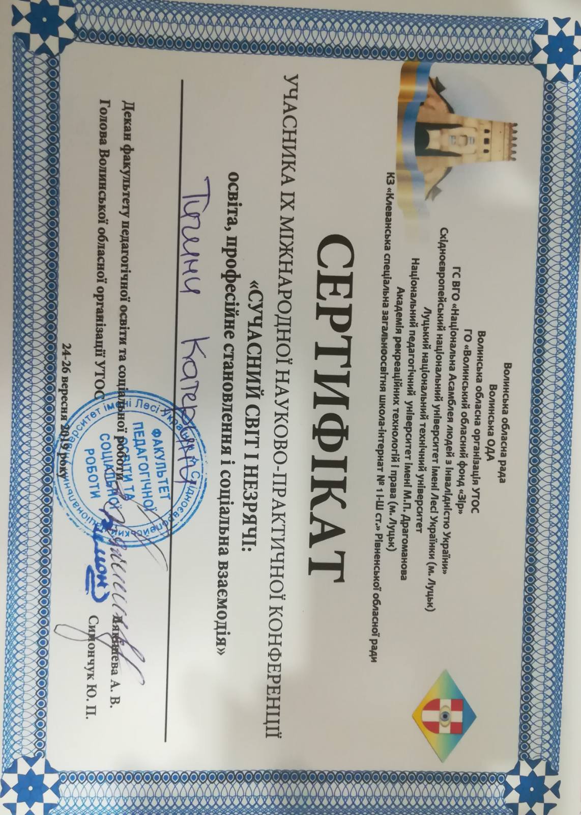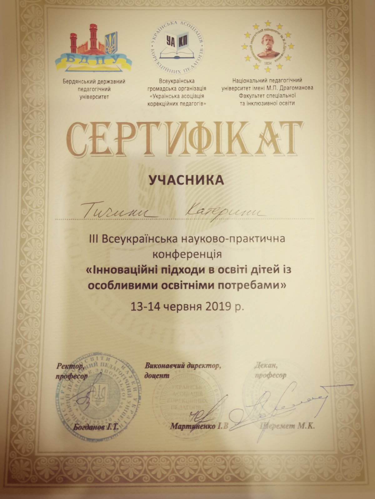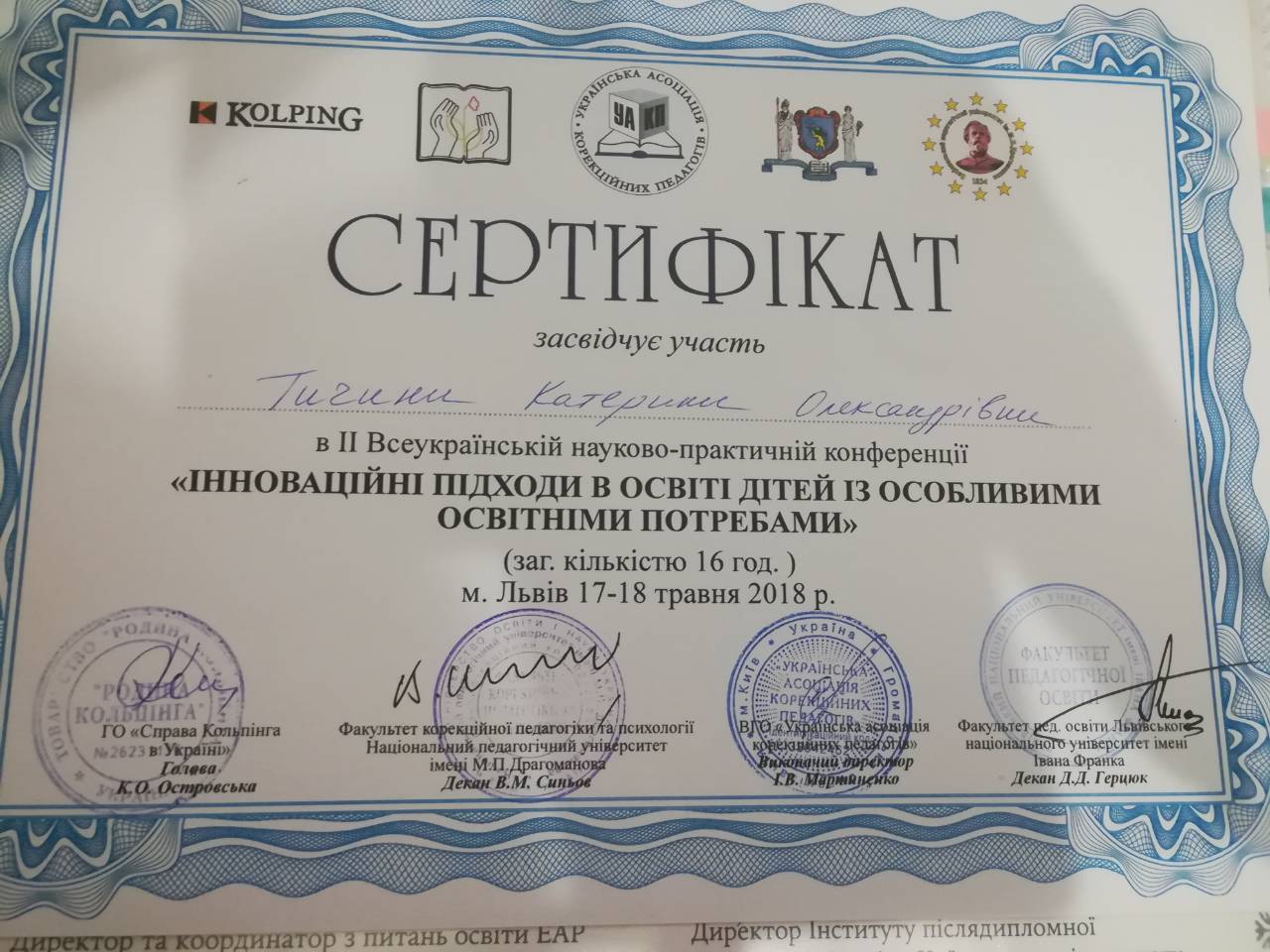 | 2670 | Всеукраїнська науково-практична конференція «Інноваційні підходи в спеціальній освіті» | Участь у тренінгових заходах та обговоренні | Всеукраїнська громадська організація «Українська асоціація корекційних педагогів», м. Київ |