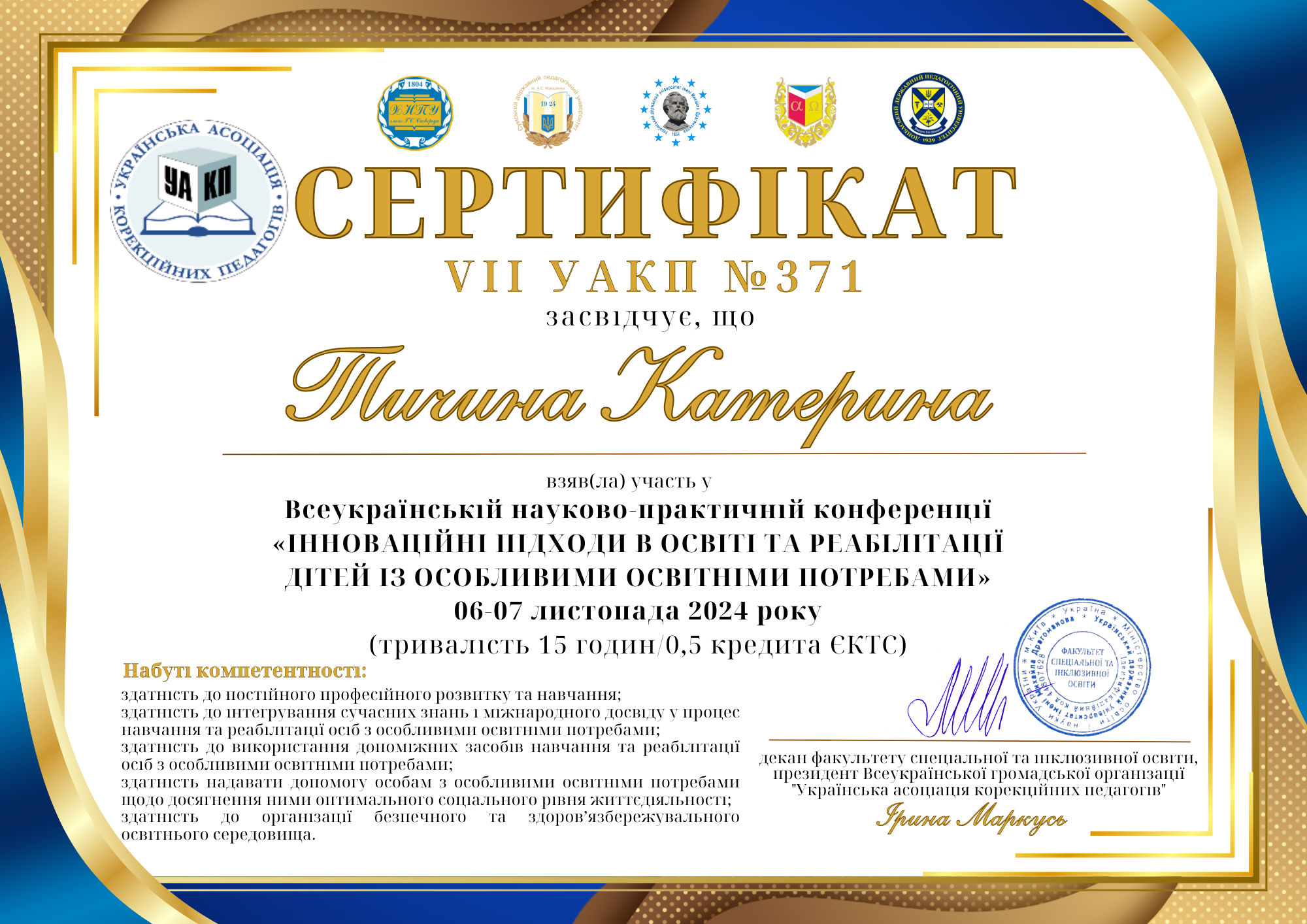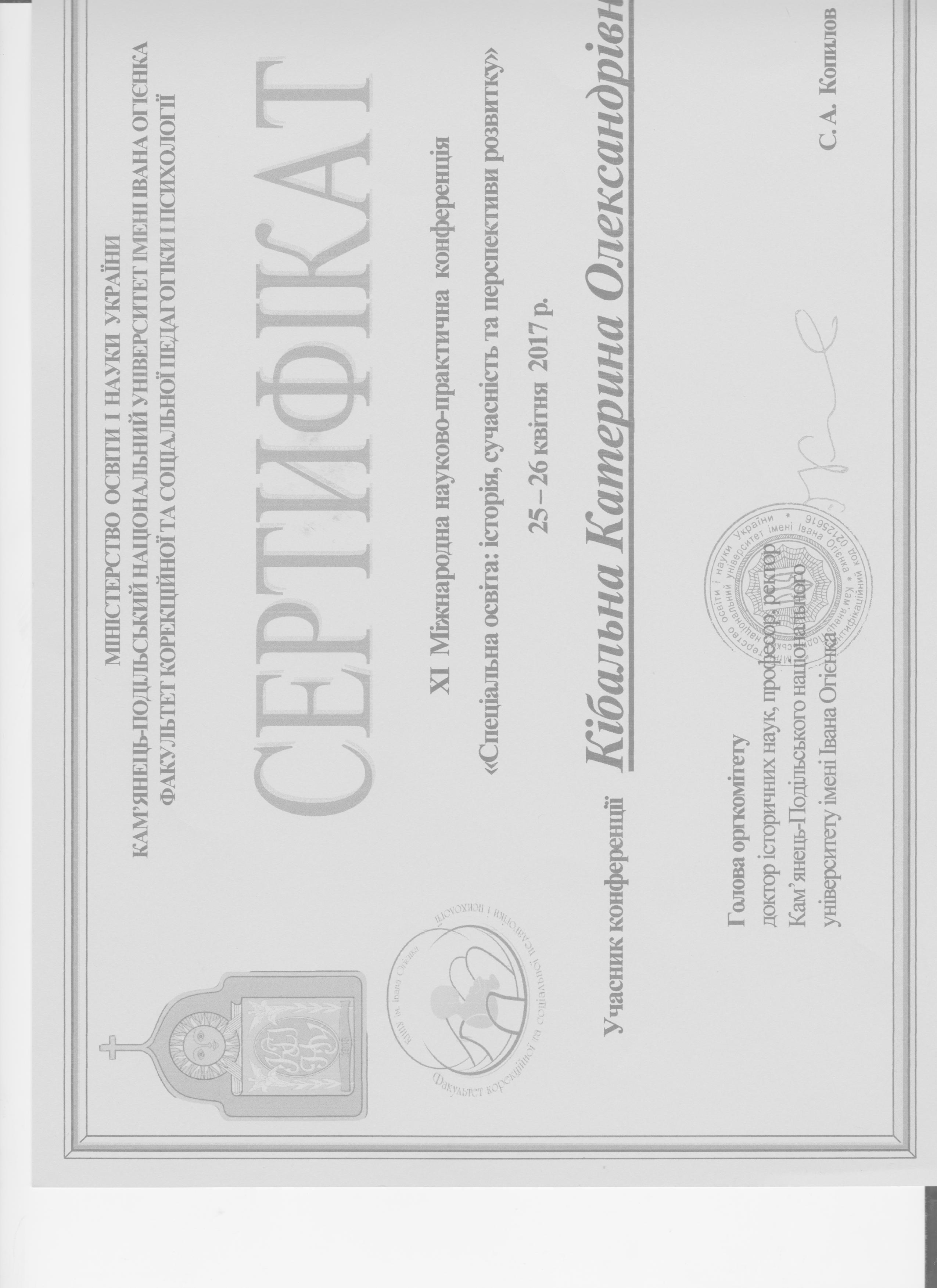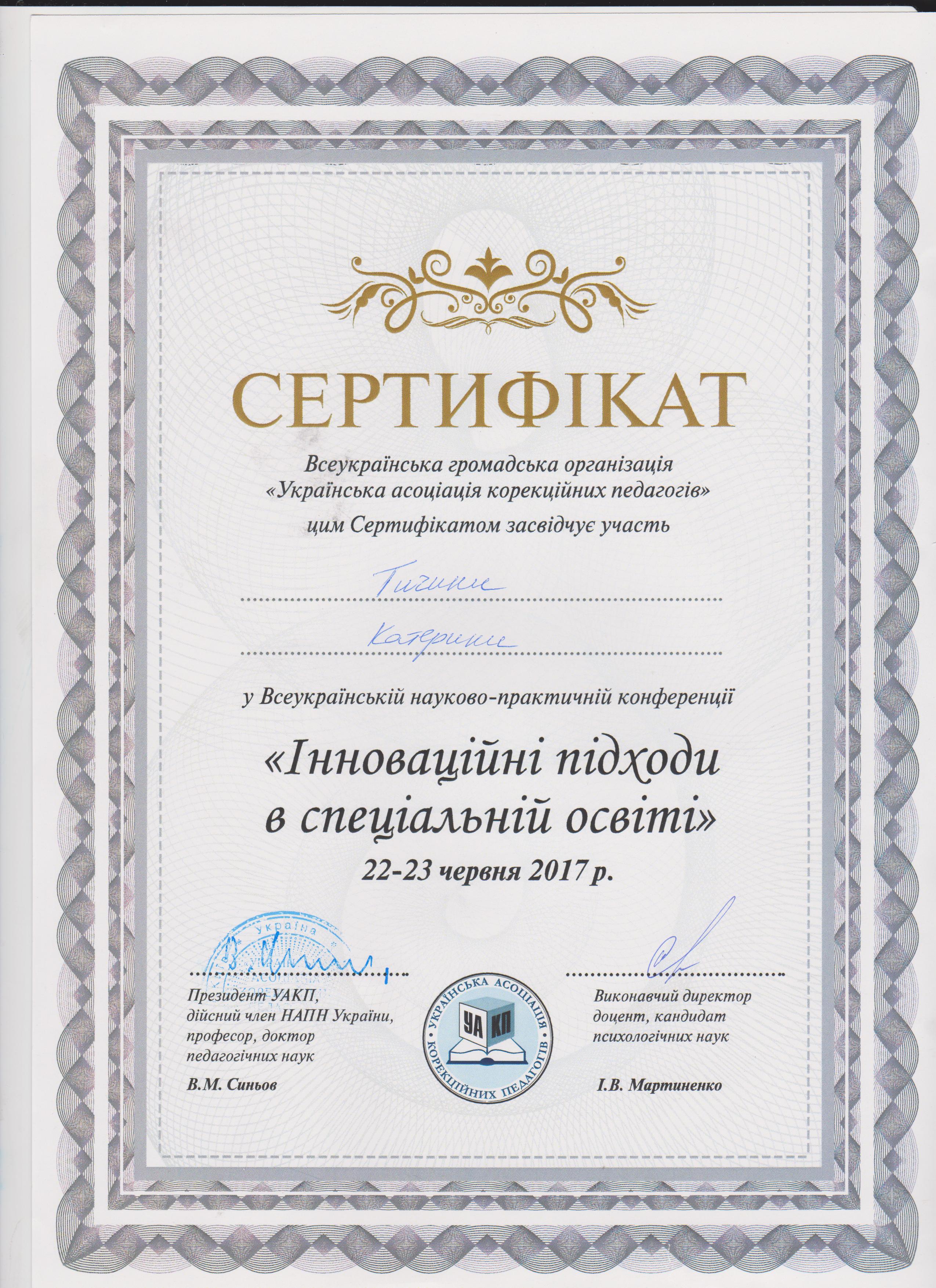 | 2670 | Всеукраїнська науково-практична конференція «Інноваційні підходи в спеціальній освіті» | Участь у тренінгових заходах та обговоренні | Всеукраїнська громадська організація «Українська асоціація корекційних педагогів», м. Київ |