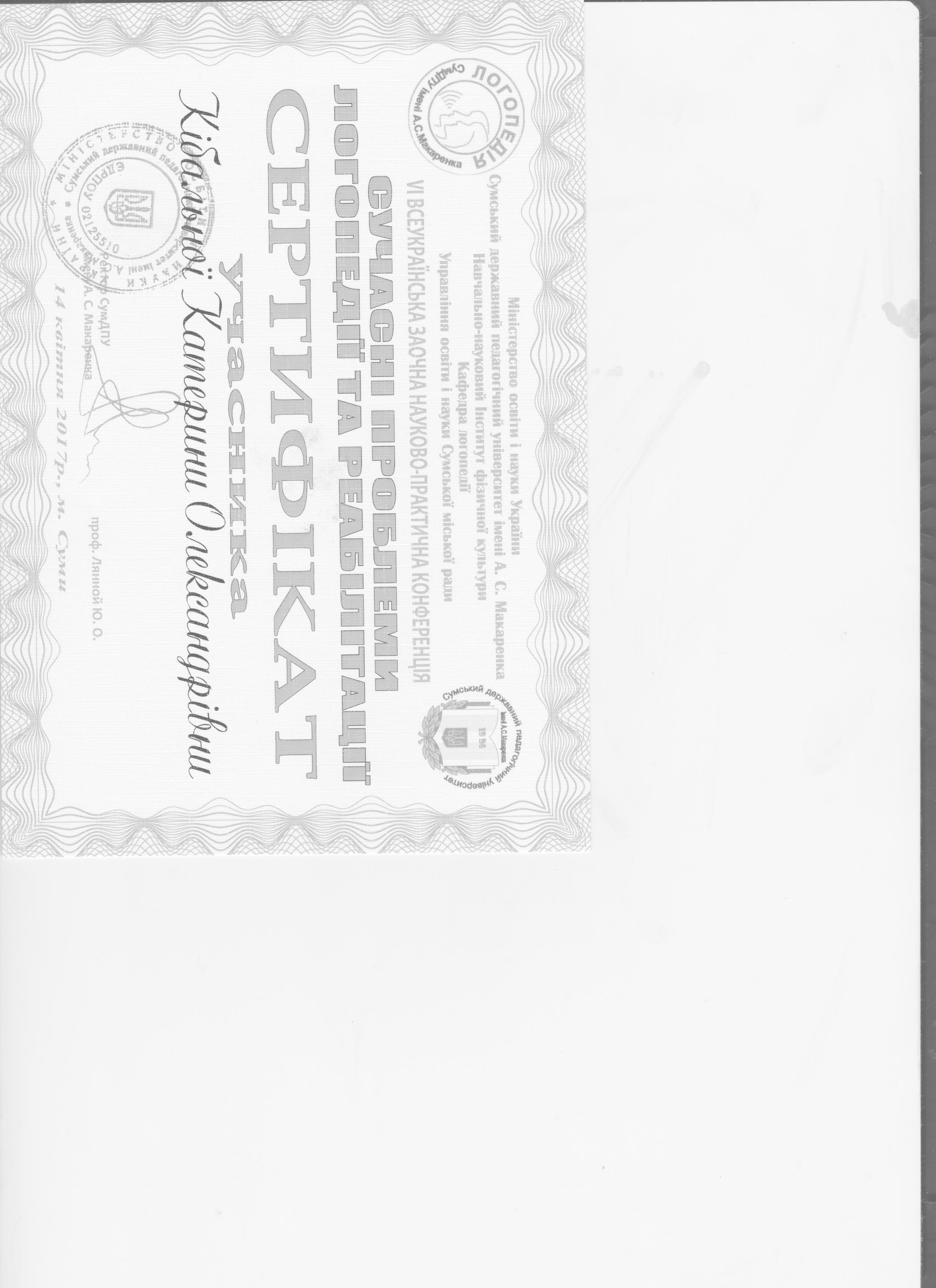 | 1869 | ІV Всеукраїнська заочна науково-практична конференція «Сучасні проблеми логопедії та реабілітації» | Використання техніки орофаціальної міофункціональної терапії в логопедичній практиці | Сумський державний педагогічний університет імені А. С. Макаренка |