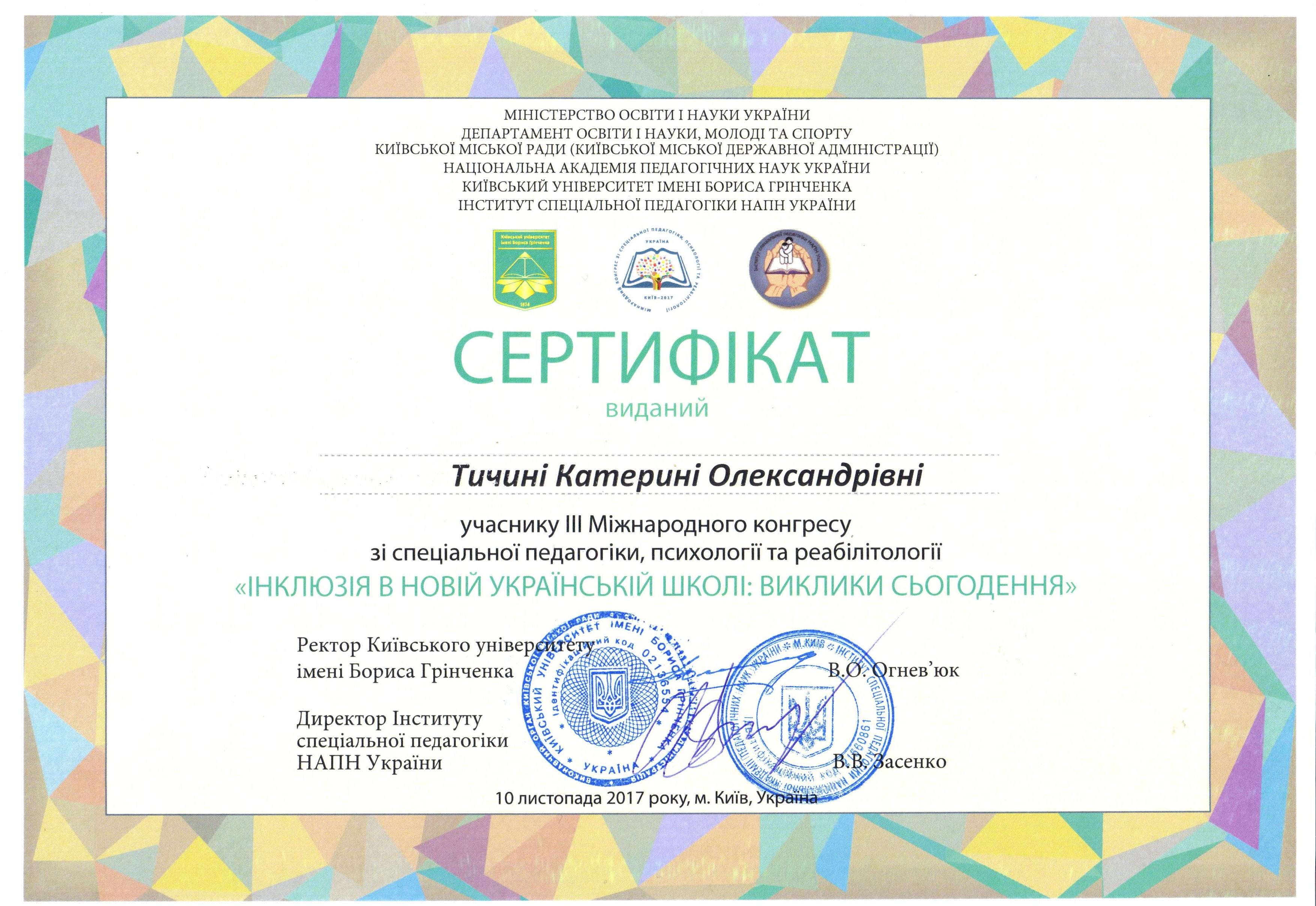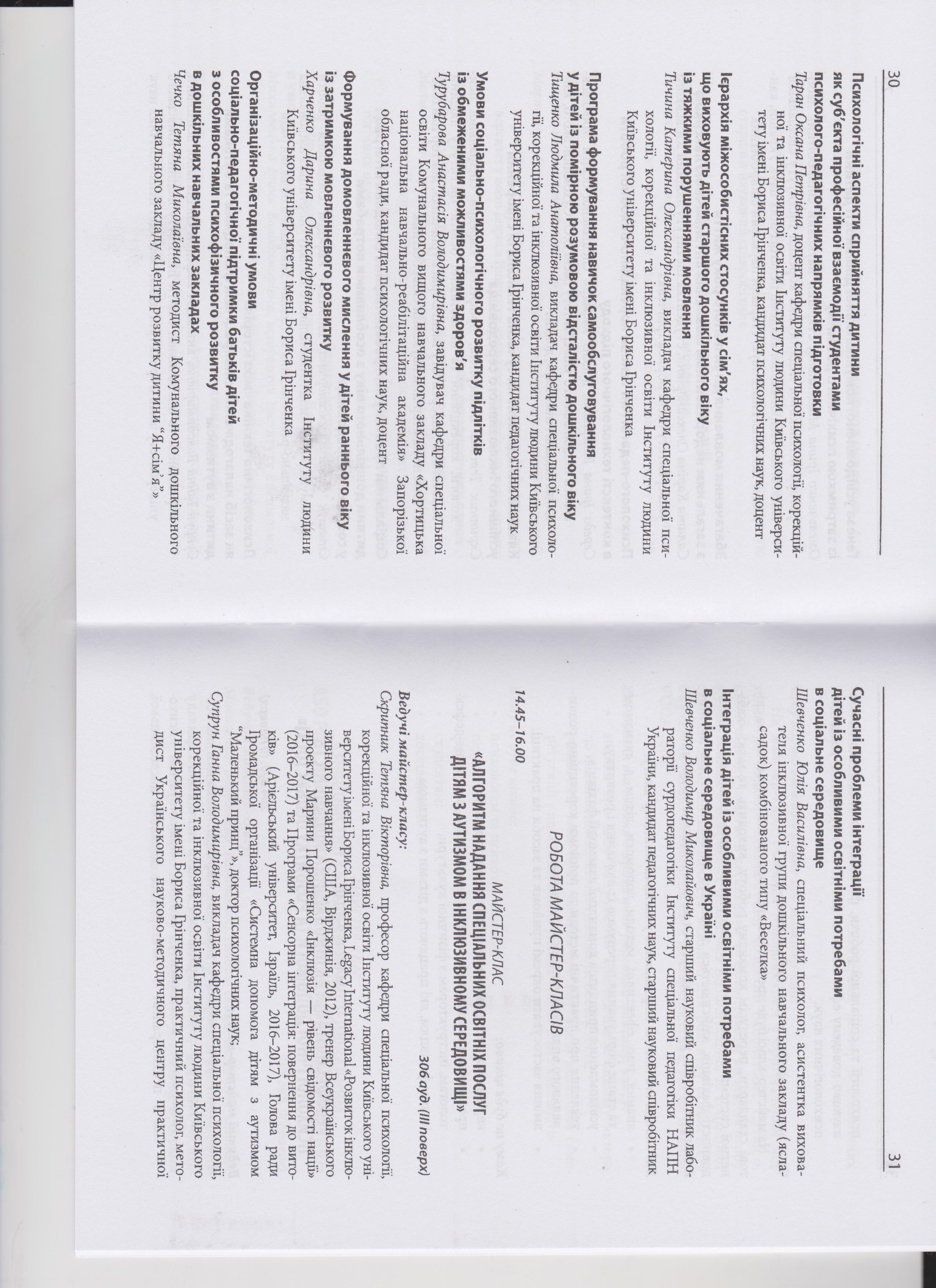 | 1161 | Інклюзія в новій українській школі: виклики сьогодення | ІІІ Міжнародний конгрес зі спеціальної педагогіки, психології та реабілітології | Київський університет імені Бориса Грінченка | 10.11.2017 00:00 | 10 |
