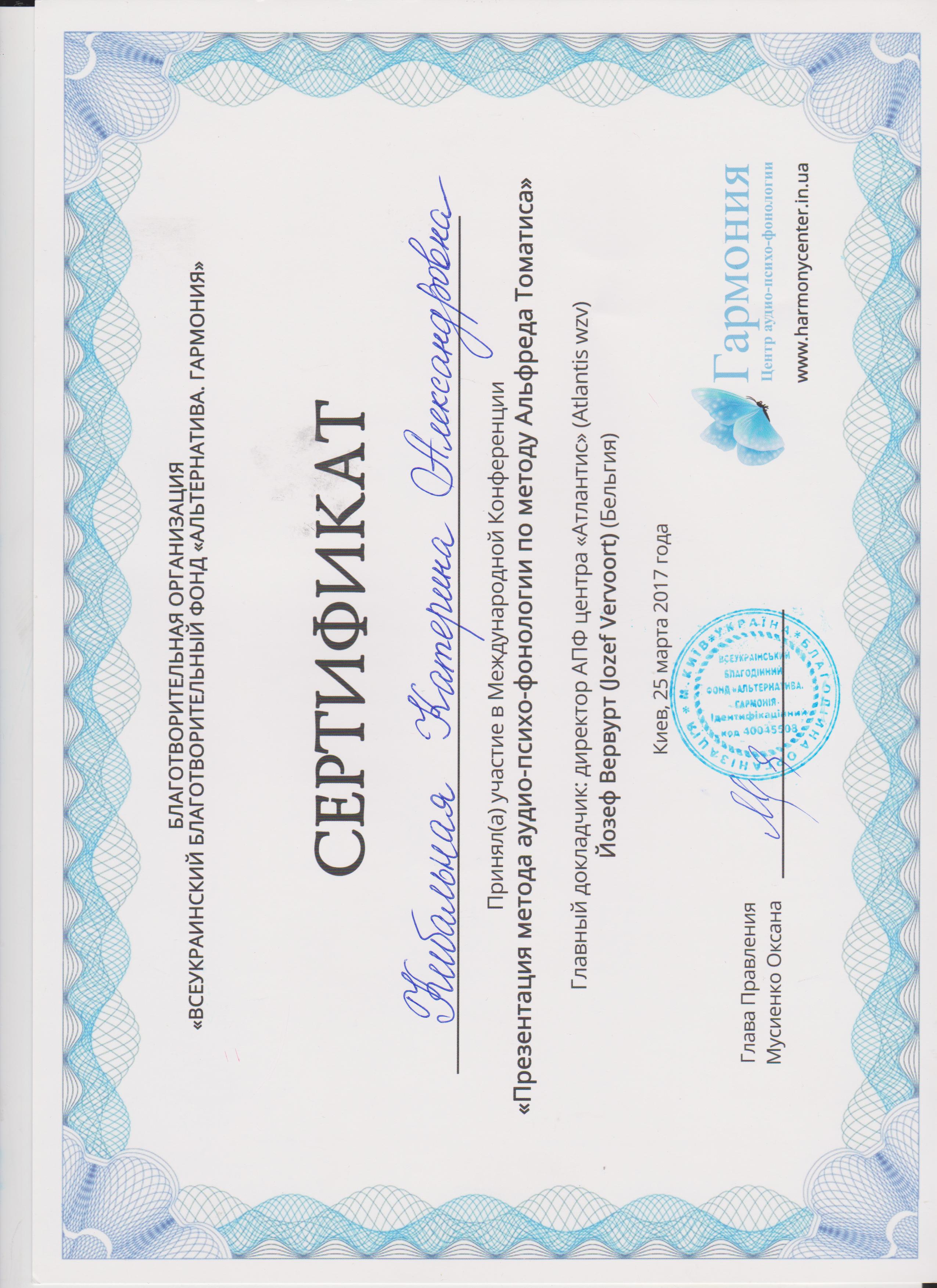 | 2668 | Міжнародна конференція «Презентація метода аудіо-психо- фонології по методу Альфреда Томатіса» | Участь у тренінгових заходах та обговоренні | Благодійна організація «Всеукраїнський благодійний фонд «Альтернатива. Гармонія» |