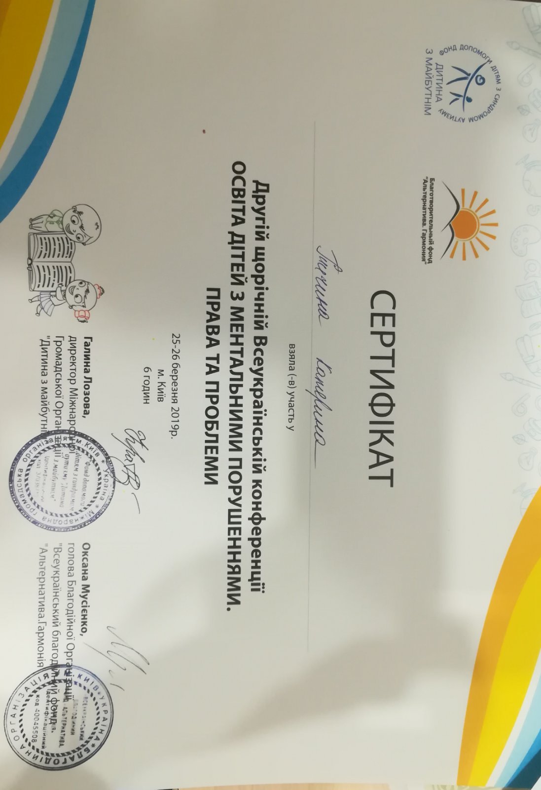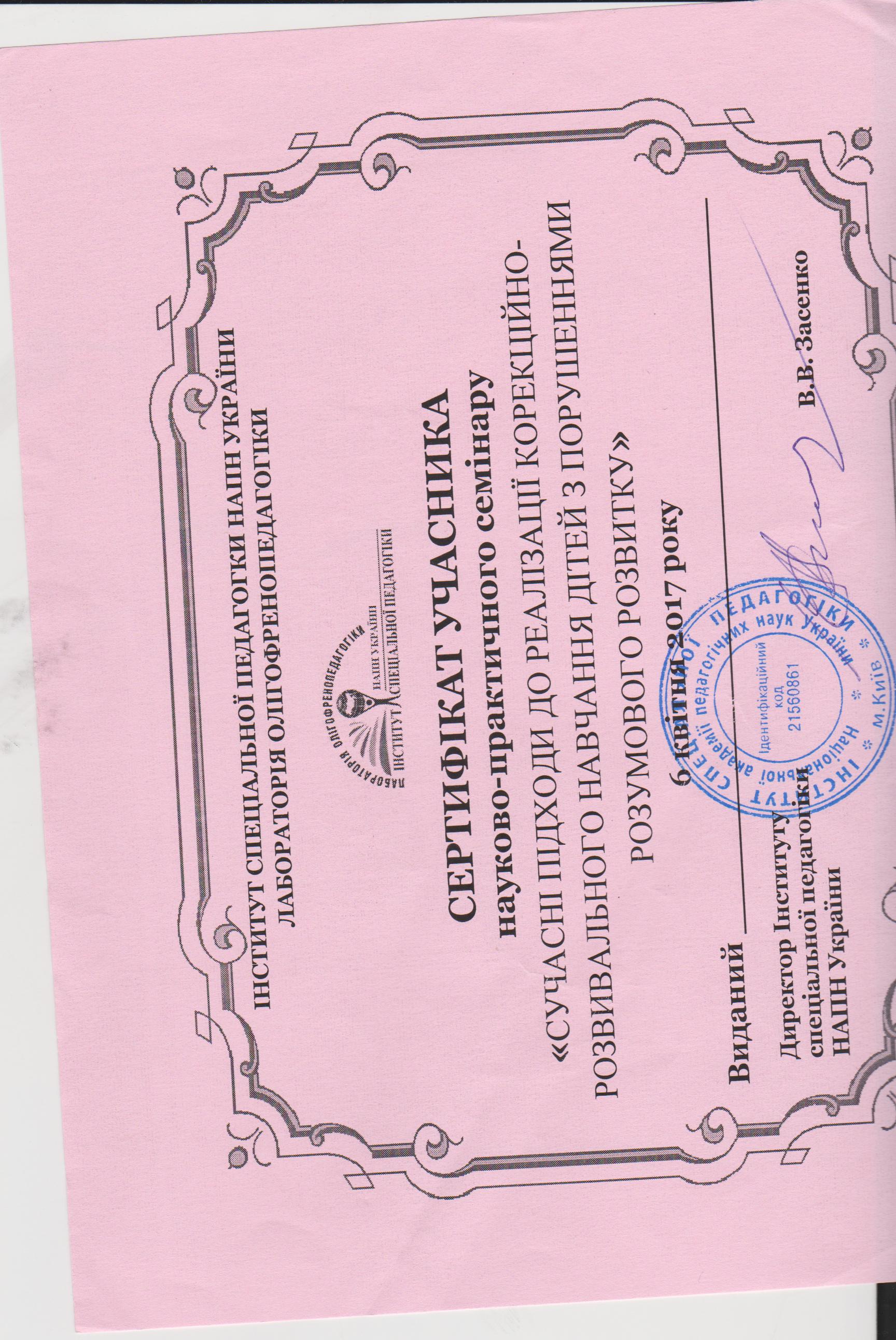 | 2669 | Науково-практичний семінар «Сучасні підходи до реалізації корекційно- розвивального навчання дітей з порушеннями розумового розвитку» | Участь в тренінгових заходах та обговоренні | Інститут спеціальної педагогіки НАПН України |