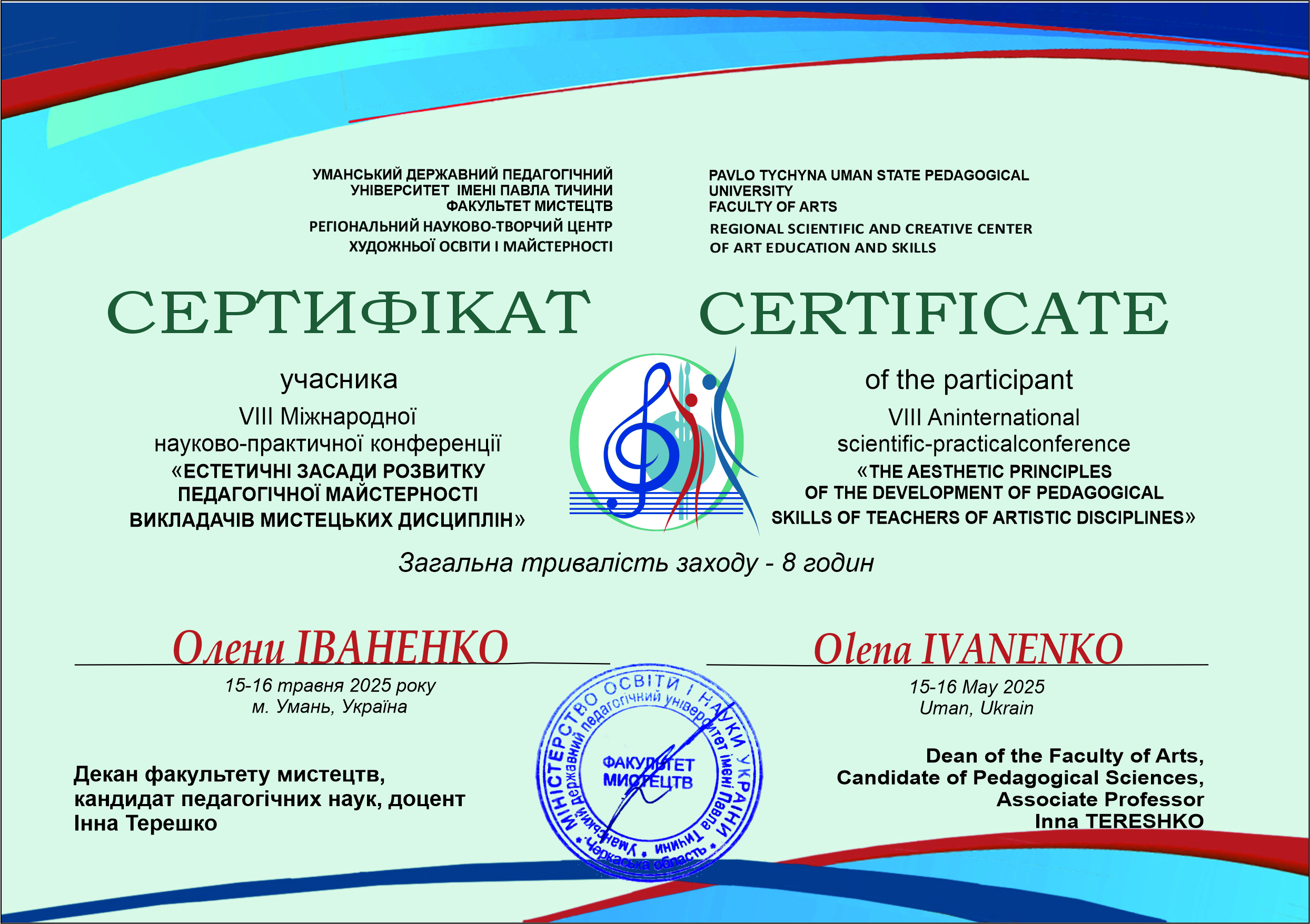 | 12439 | VII Міжнародна науково-практична конференція "Естетичні засади розвитку педагогічної майстерності викладачів мистецьких дисциплін" | Розвиток музичних здібностей у процесі професійної підготовки майбутнього актора драматичного театру і кіно | м.Умань |