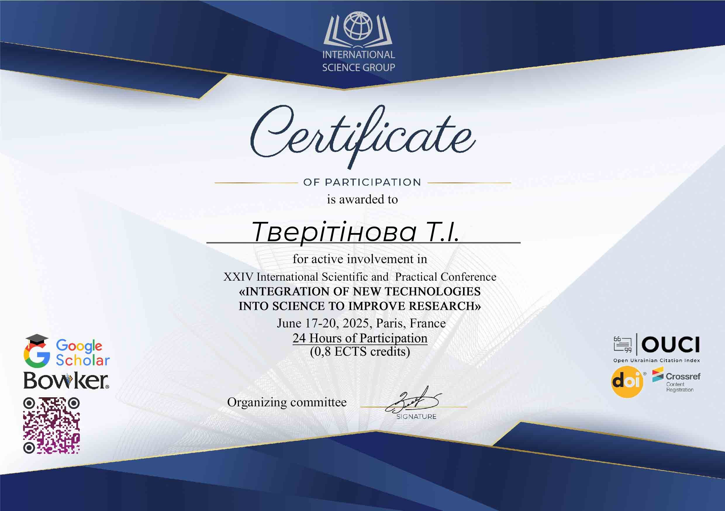 | 10602 | XXIV International Scientific and Practical Conference «Modern technologies among us in the environment» | «Проблема «Інший» / «Інакший» в романі Д. Ріс «Широке Саргасове море» | Rome, Italy |