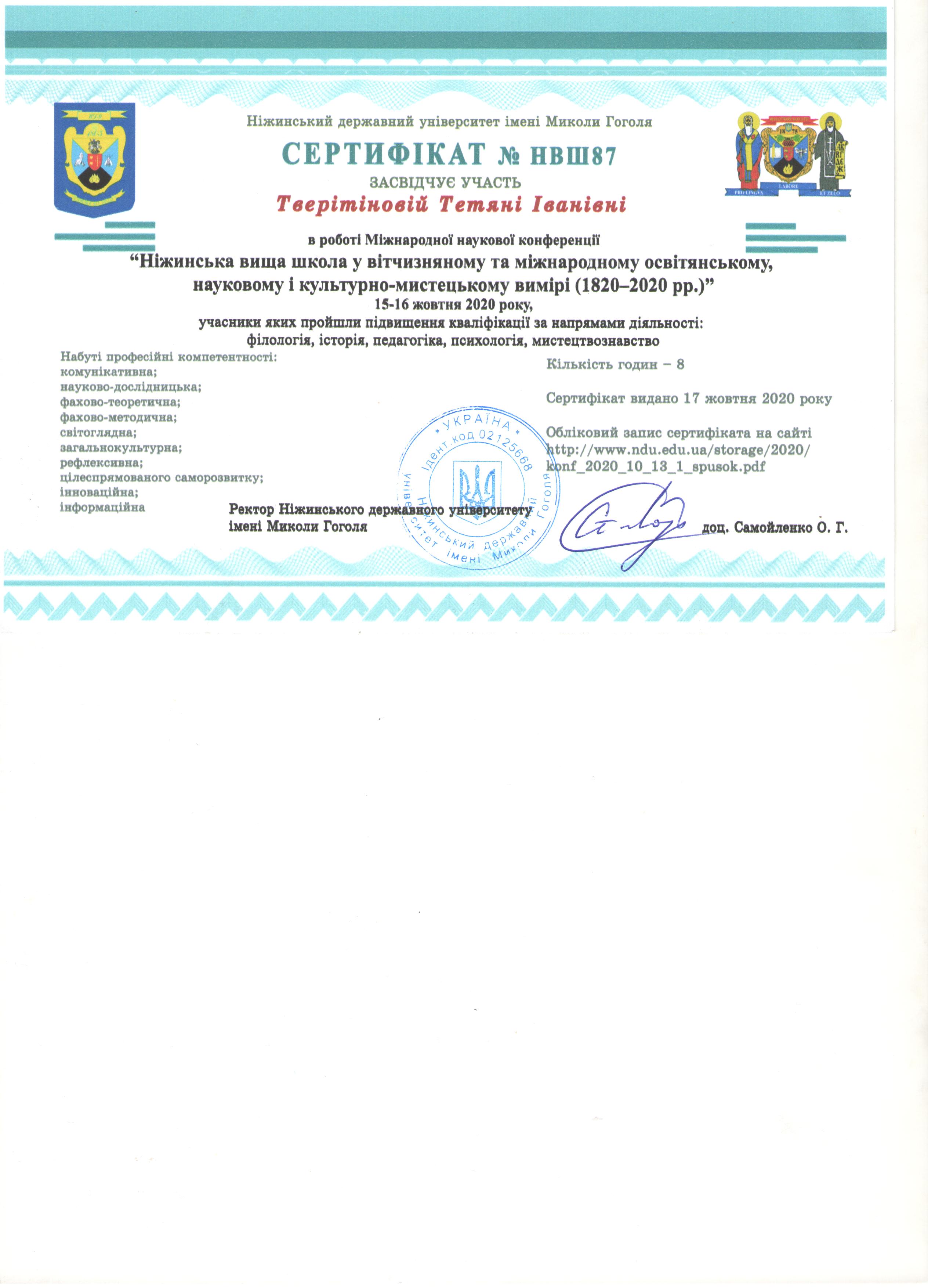 | 6272 | Ніжинська вища школа у вітчизняному та міжнародному освітянському, науковому і культурно-мистецькому вимірі (1820-2020) | Мемуарна спадщина Н.В. Кукольника | Ніжинський державний університет |