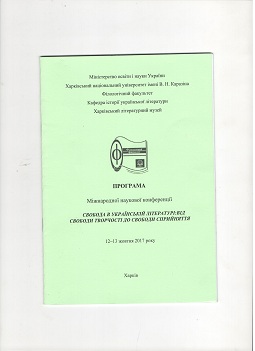 | 2691 | Міжнародна наукова конференція "Свобода в українській літературі: від свободи творчості до свободи сприйняття" | Функціонування трикутника автор-виконавці-глядачі у перфомансі (на матеріалі п'єси Юрія Тарнавського "Чотири проекти на український національний прапор") | Харківський національний університет імені В.Н.Каразіна |