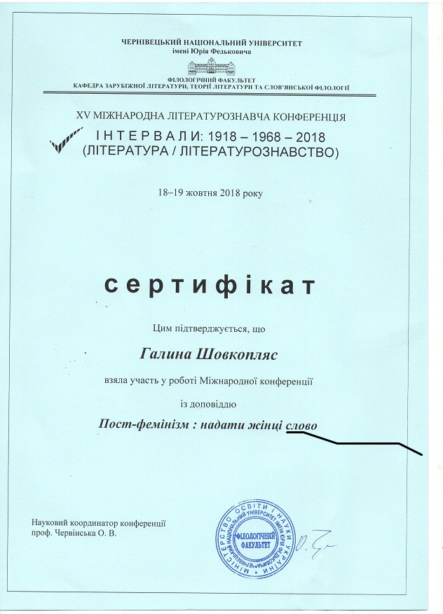 | 3450 | ХУ Міжнародна літературознавча конференція "Інтервали : 1918-1968-2018 (література-літературознавство)" | Пост-фемінізм: надати жінці слово. | Чернівецький національний університет імені Юрія Федьковича, філологічний ф-т,кафедра зарубіжної літератури, теорії літературита слов'янських літератур |