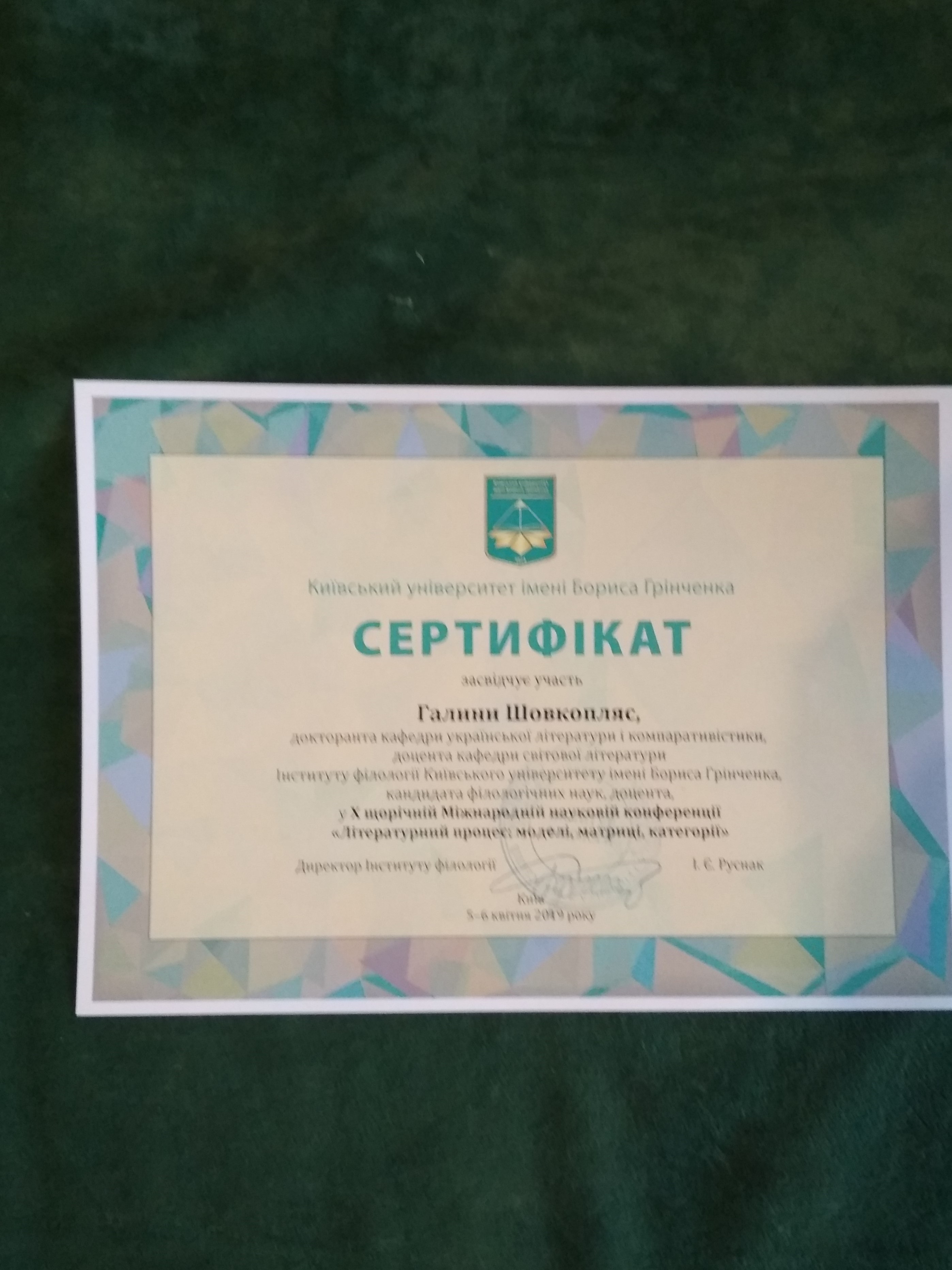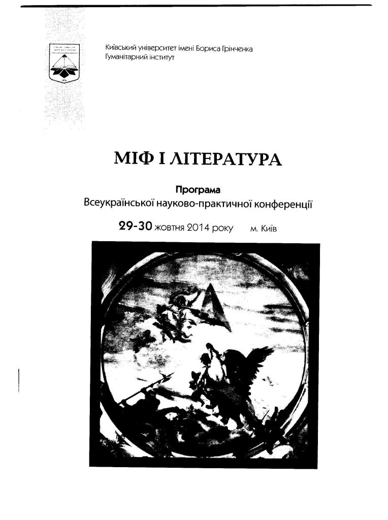 | 947 | Всеукраїнська науково -практична конференція 'Міф і література' | Актуалізація античних міфів у сучасній поезії. | Київський університет імені Бориса Грінченка |