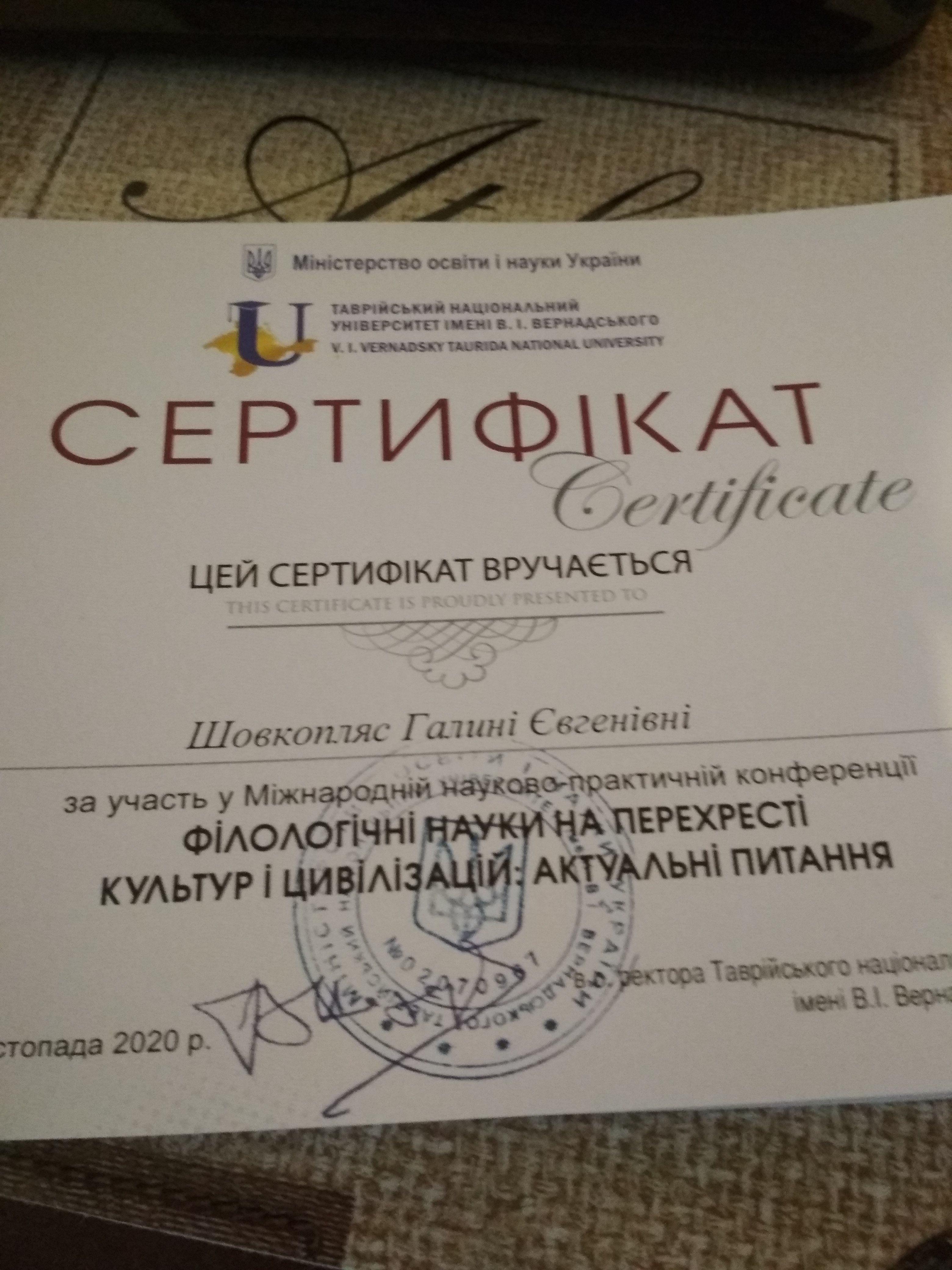 | 6317 | Міжнародна науково-практична конференція "Філологічні науки на перехресті культур і цивілізацій: актуальні питання" | Бабусин дім. До проблеми національної ідентичності в творах авторів української зарубіжної літератури другої та третьої хвилі еміграції. | Таврійський національний університет імені В.І.Вернадського |