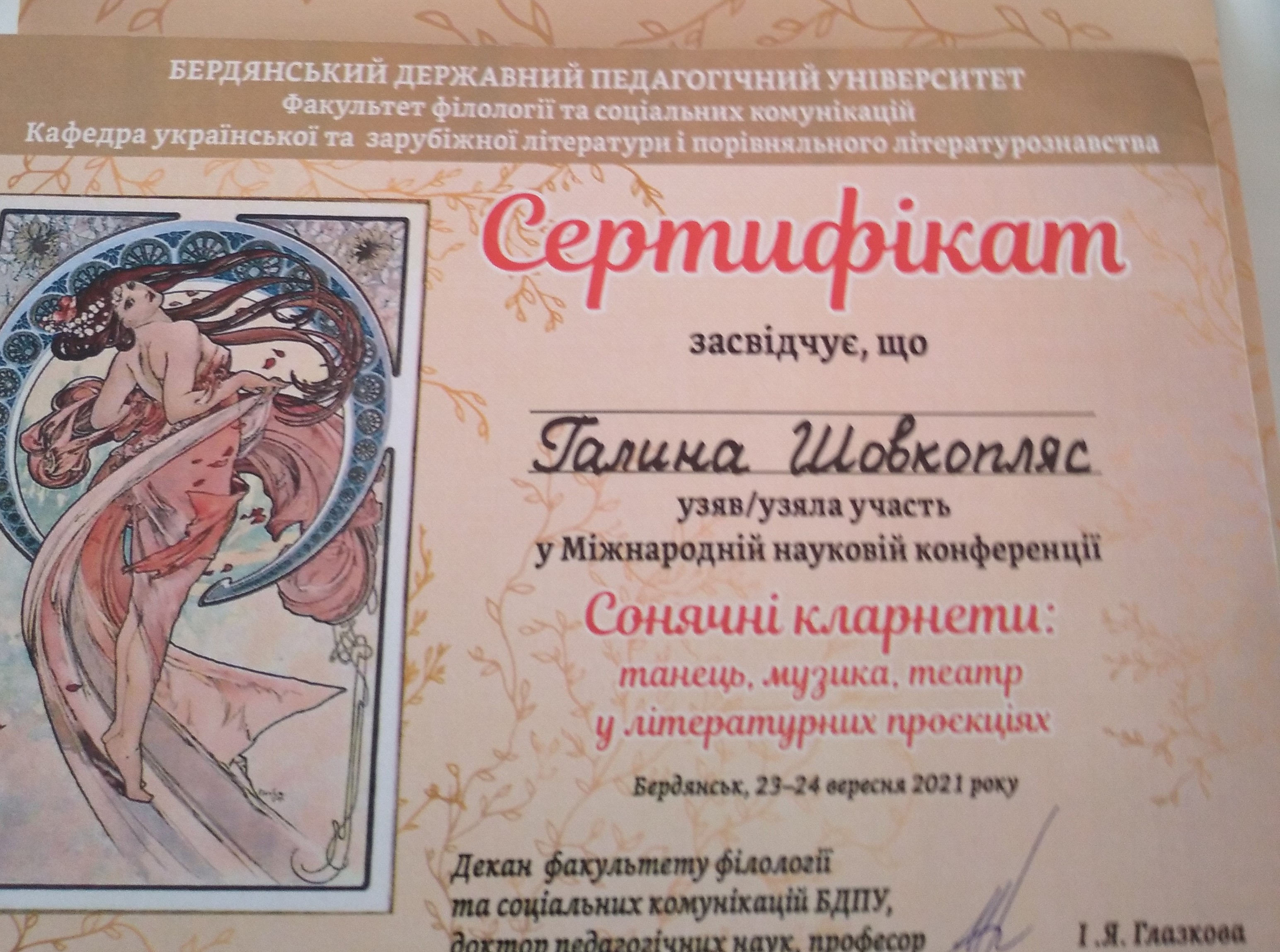 | 7360 | Сонячні кларнети: танець, музика, театр у літературних проєкціях. | Театр Віри Вовк: заперечення інтермедіальності | Бердянський педагогічний університет |
